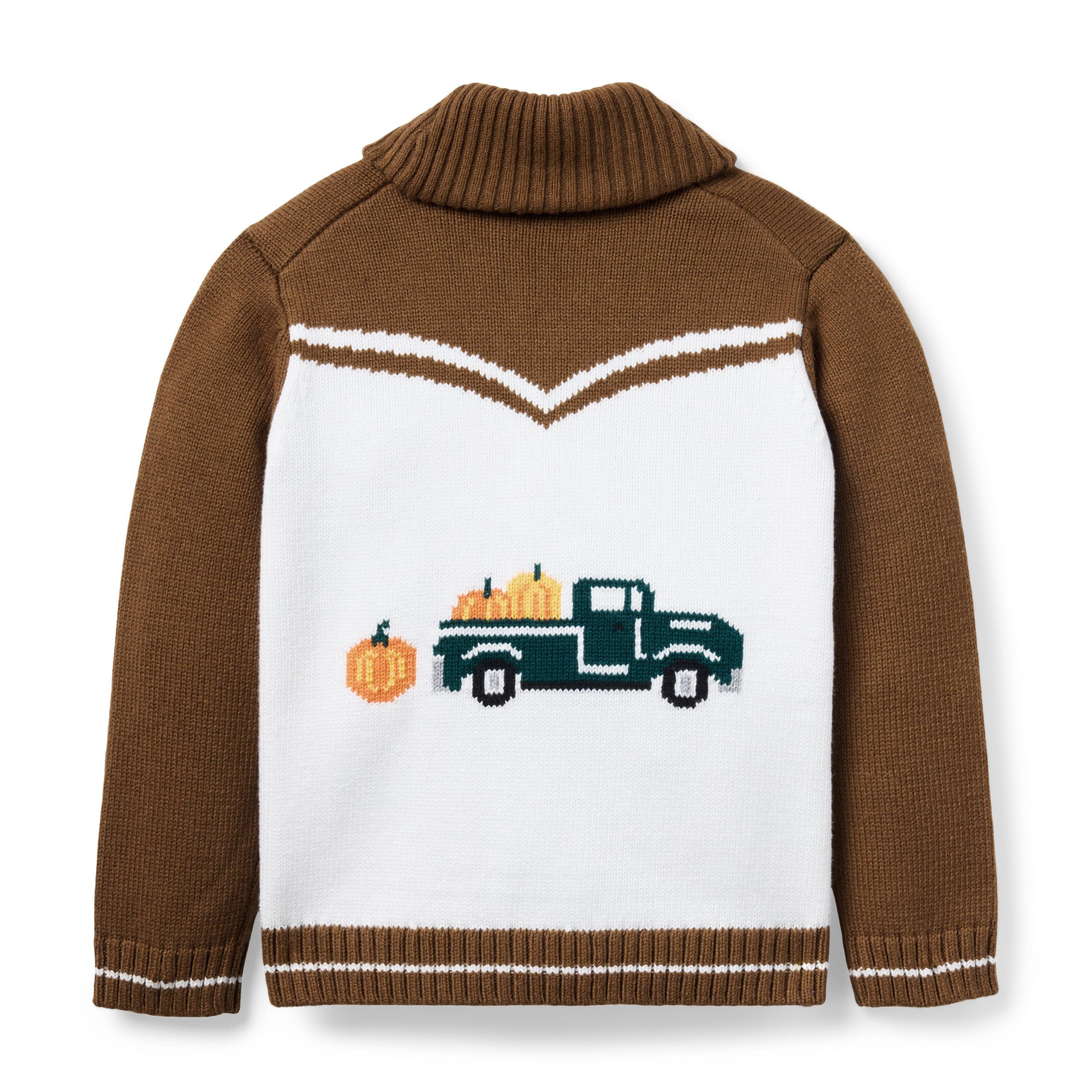 • An iconic must-have for fall, our shawl collar cardigan is crafted with festive details, like an intarsia-knit pumpkin truck at the back and a little pumpkin at the pocket.