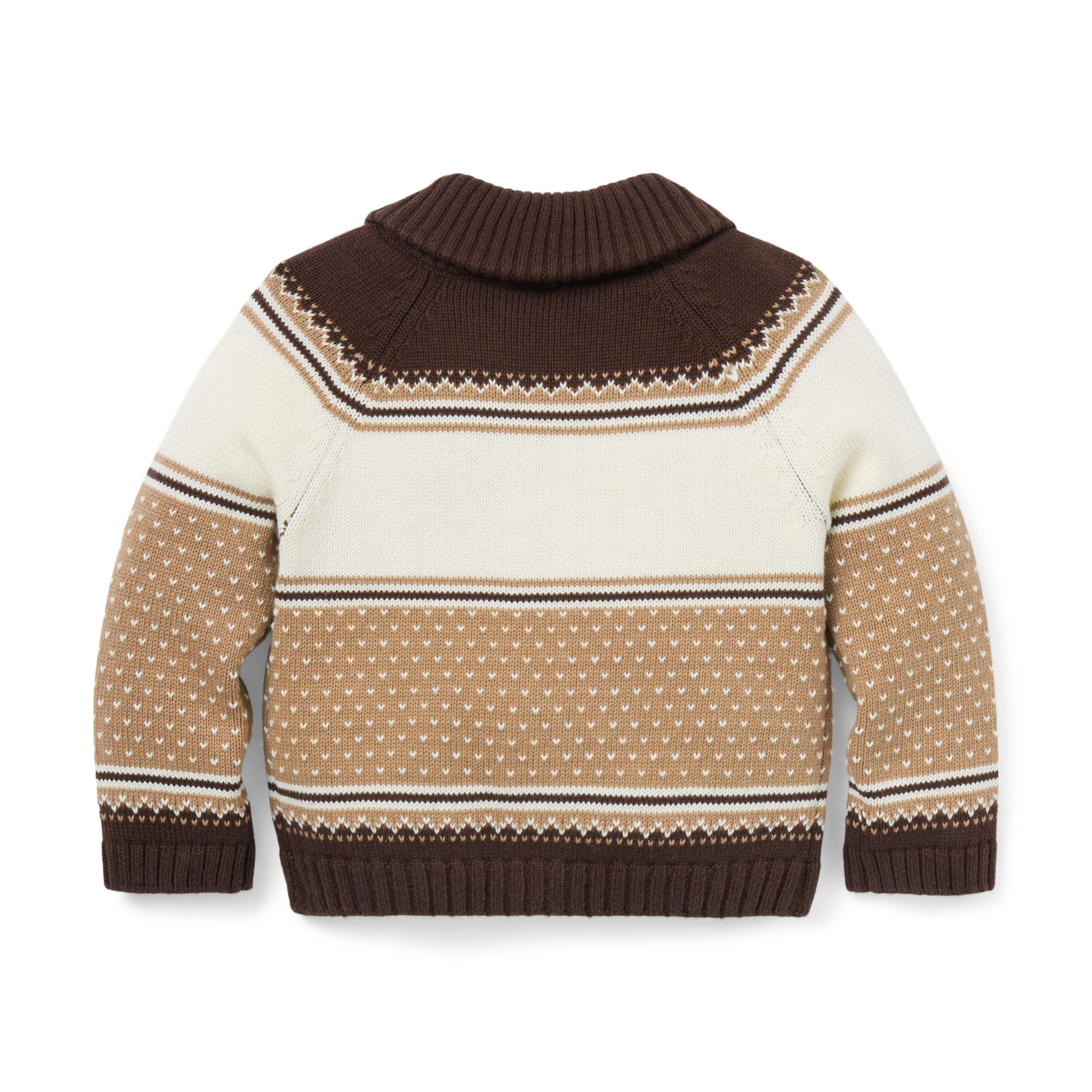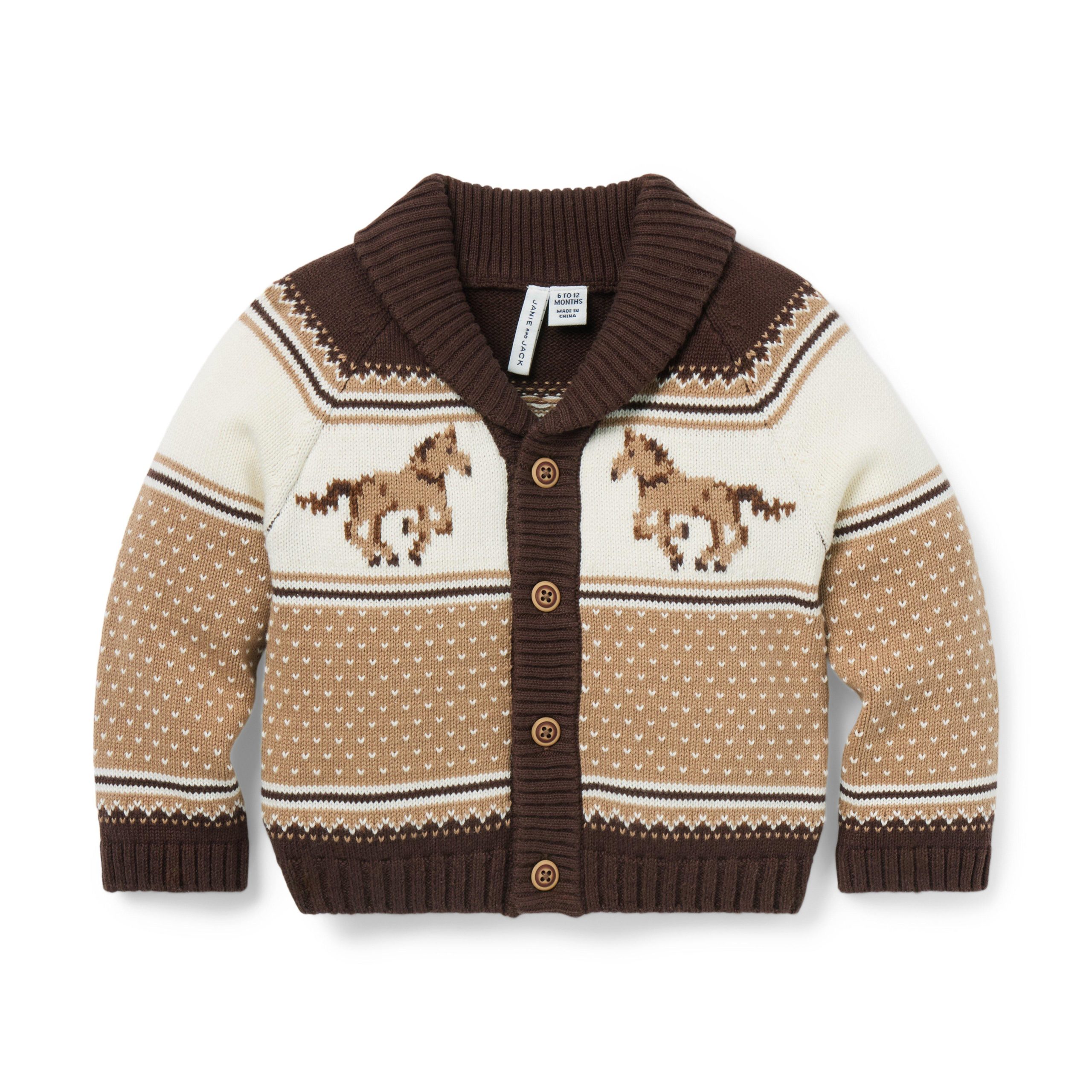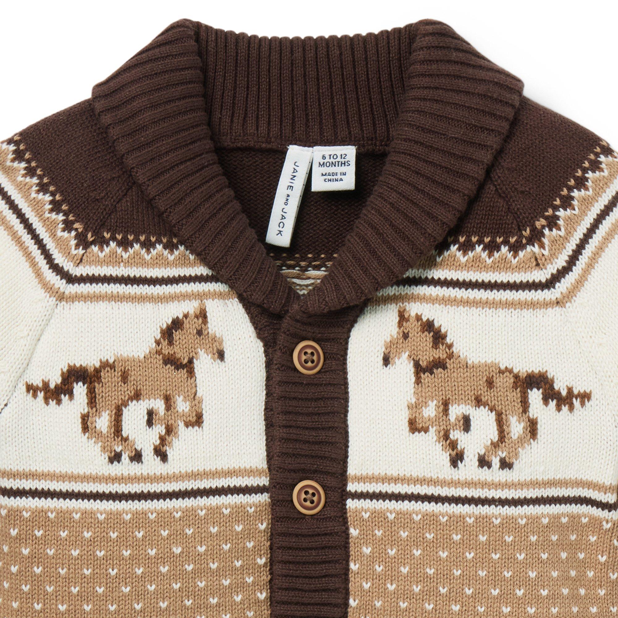 • Layer up—our intarsia-knit cardigan is ready to head west. Made in soft combed cotton with intarsia-knit horses, Fair Isle details and a shawl collar too.