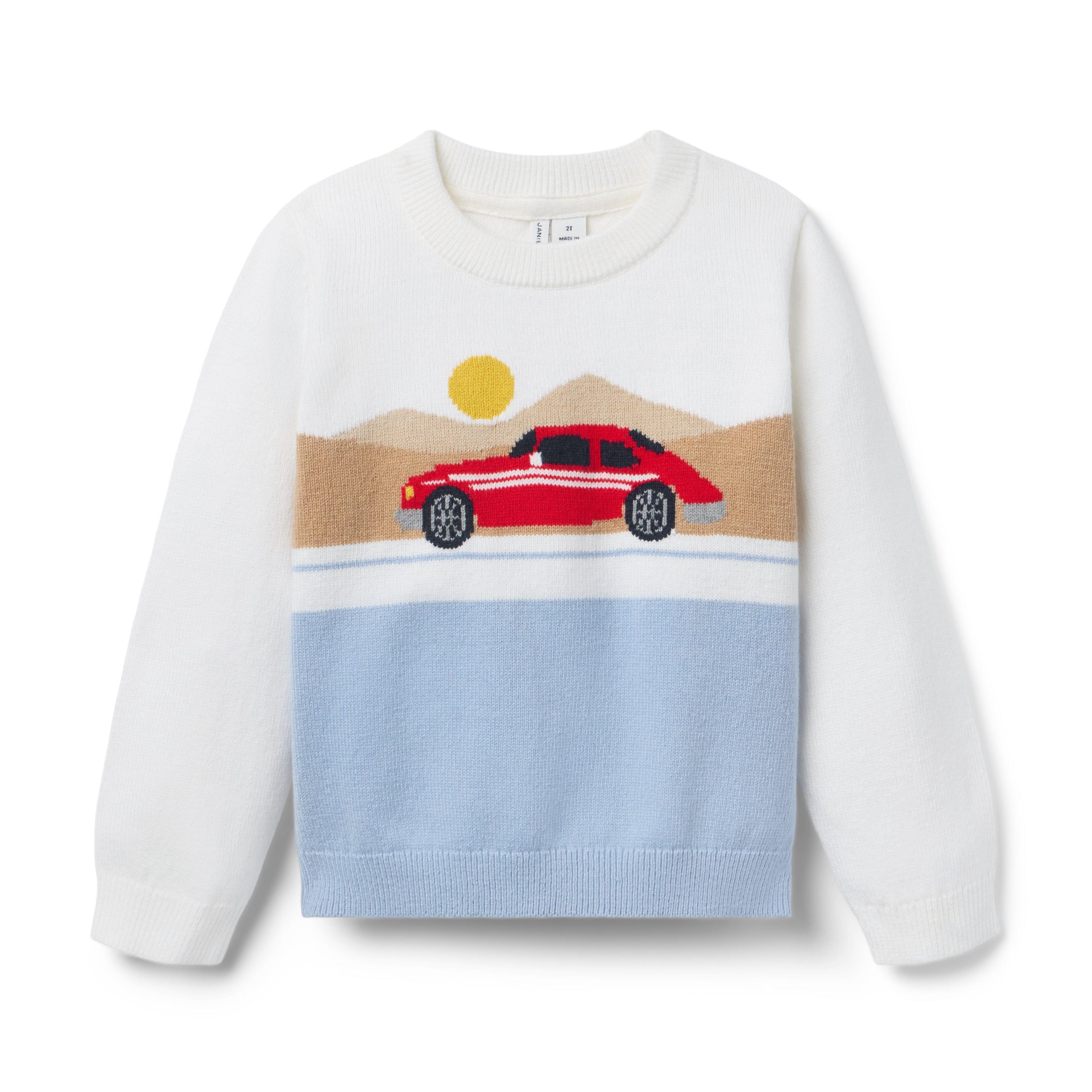 • Take the fast track to style in our soft and cozy sweater. Featuring an intarsia-knit race car design and ribbed details too.