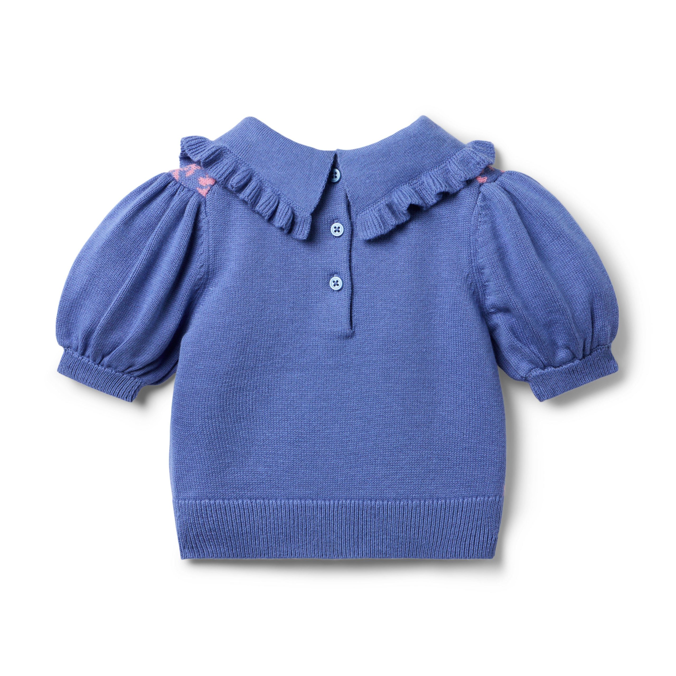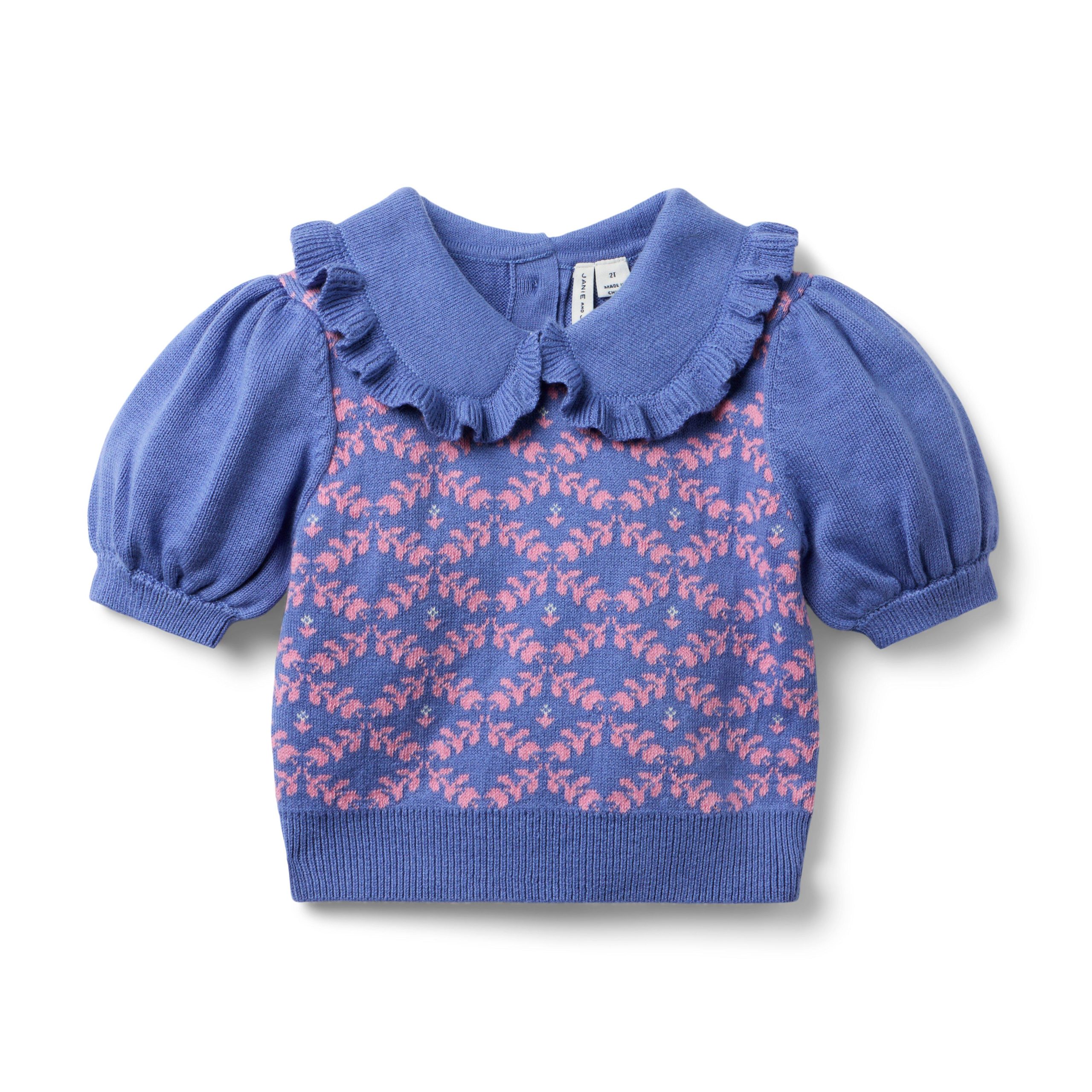 • Picture this: sweater weather style that’s right on trend. This soft and cozy sweater features a knit jacquard pattern, puff sleeves and a ruffle detail at the collar.