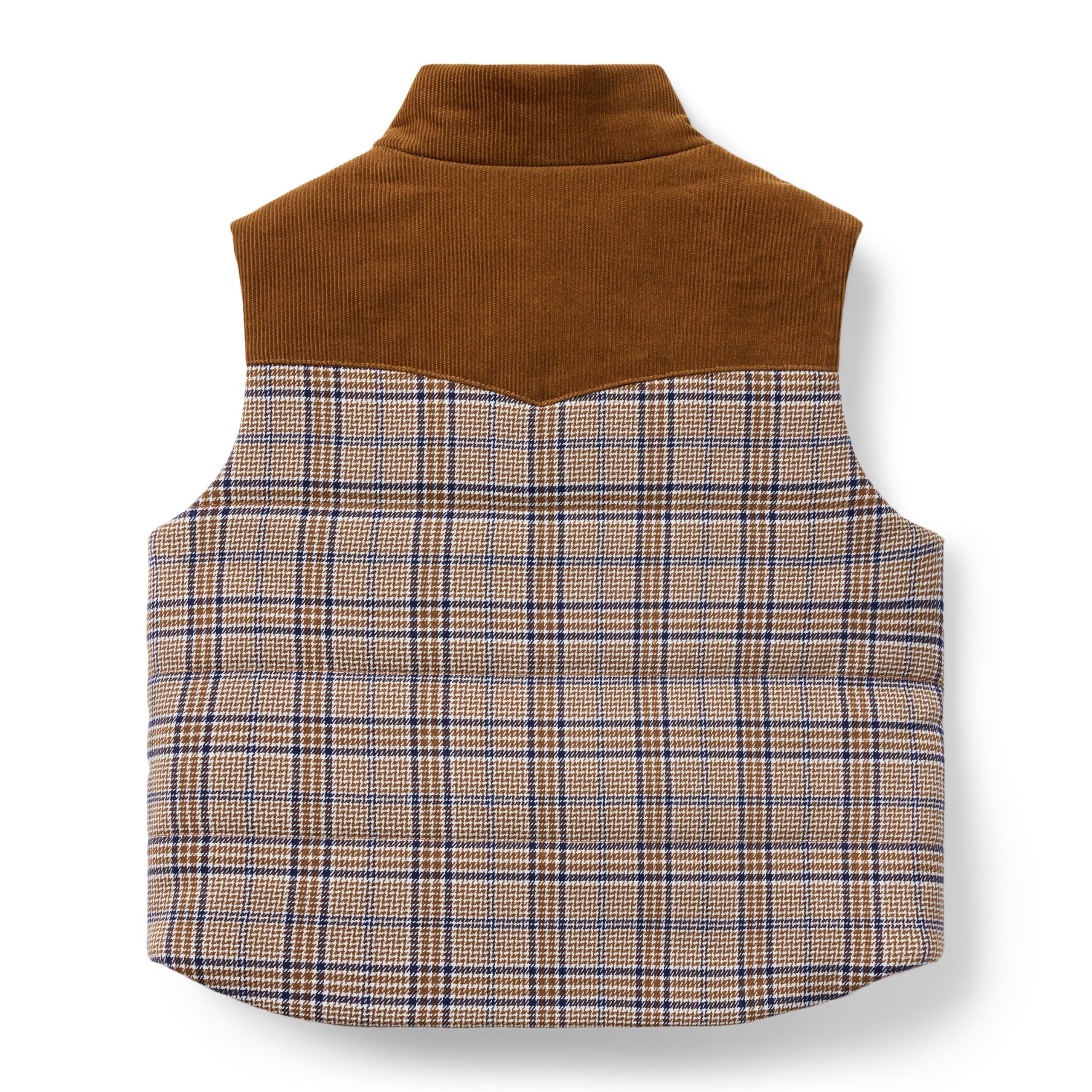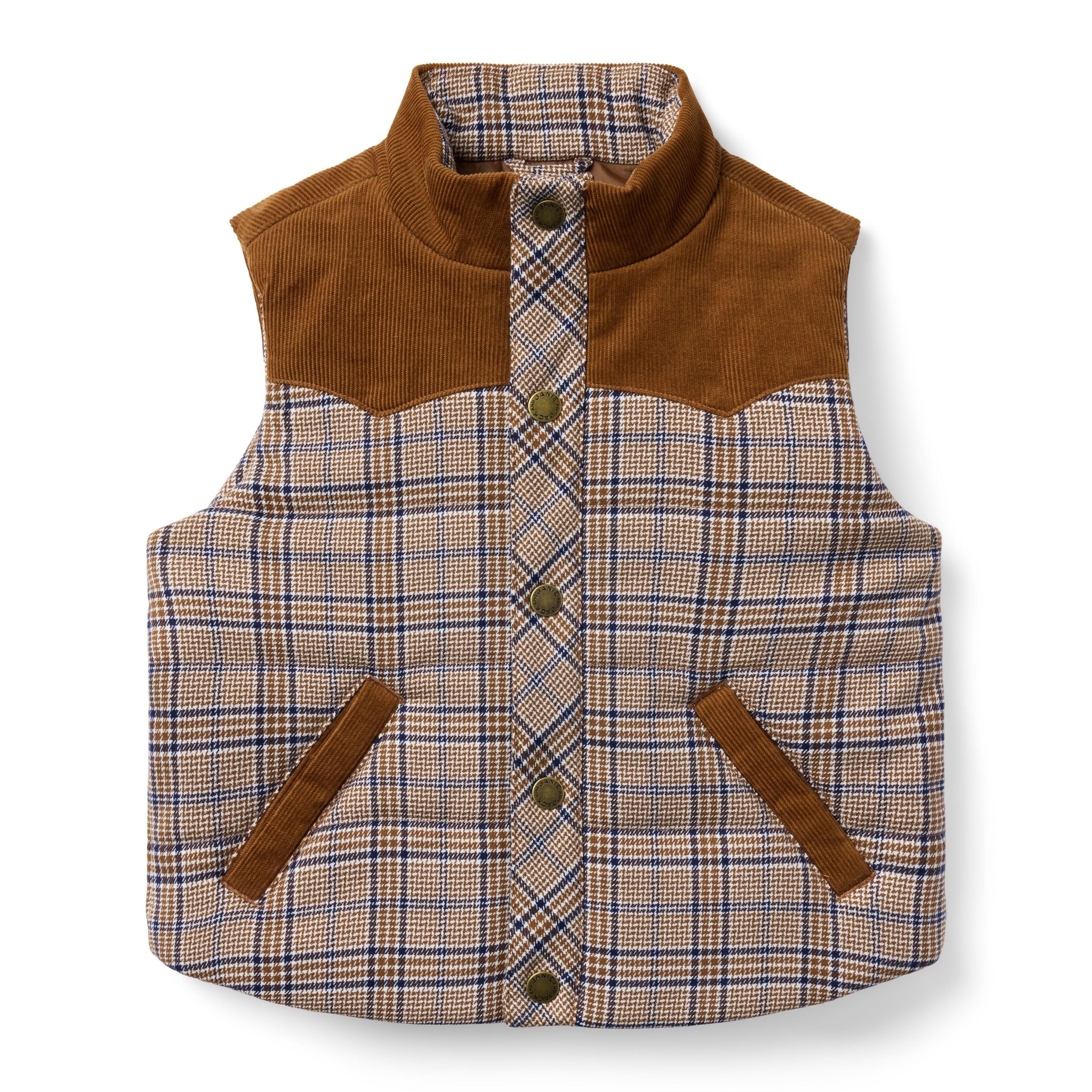• We’re heading west with our cowboy-inspired vest. It’s a wardrobe favorite that features allover plaid and cozy corduroy details.