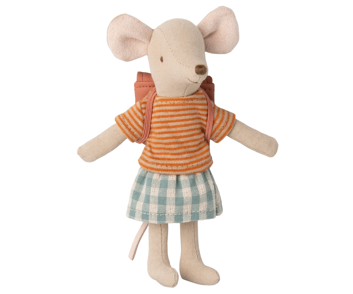 A big sister mouse is dressed for a day in kindergarten or school as she is bringing her backpack. She has magnets in her hands so she can hold the tricycle handles tight for the fast trip.