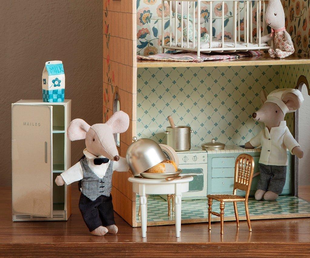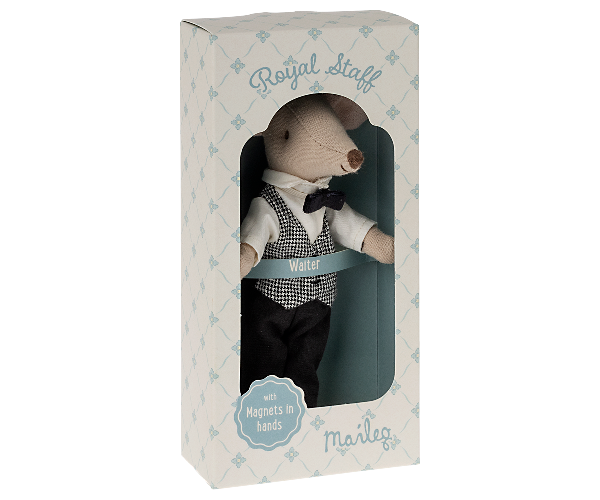 The waiter mouse is the perfect helper at any party or for the royal family anytime. Our Waiter mouse is dressed classically and has magnets in the hands, so it is easier to hold all metal utensils, such as our cheese bell.