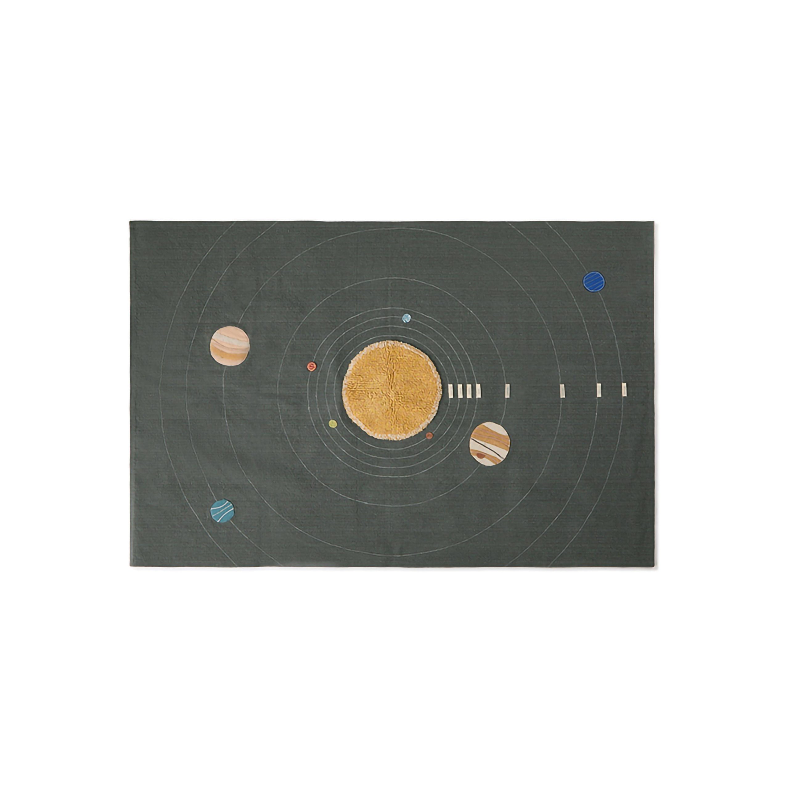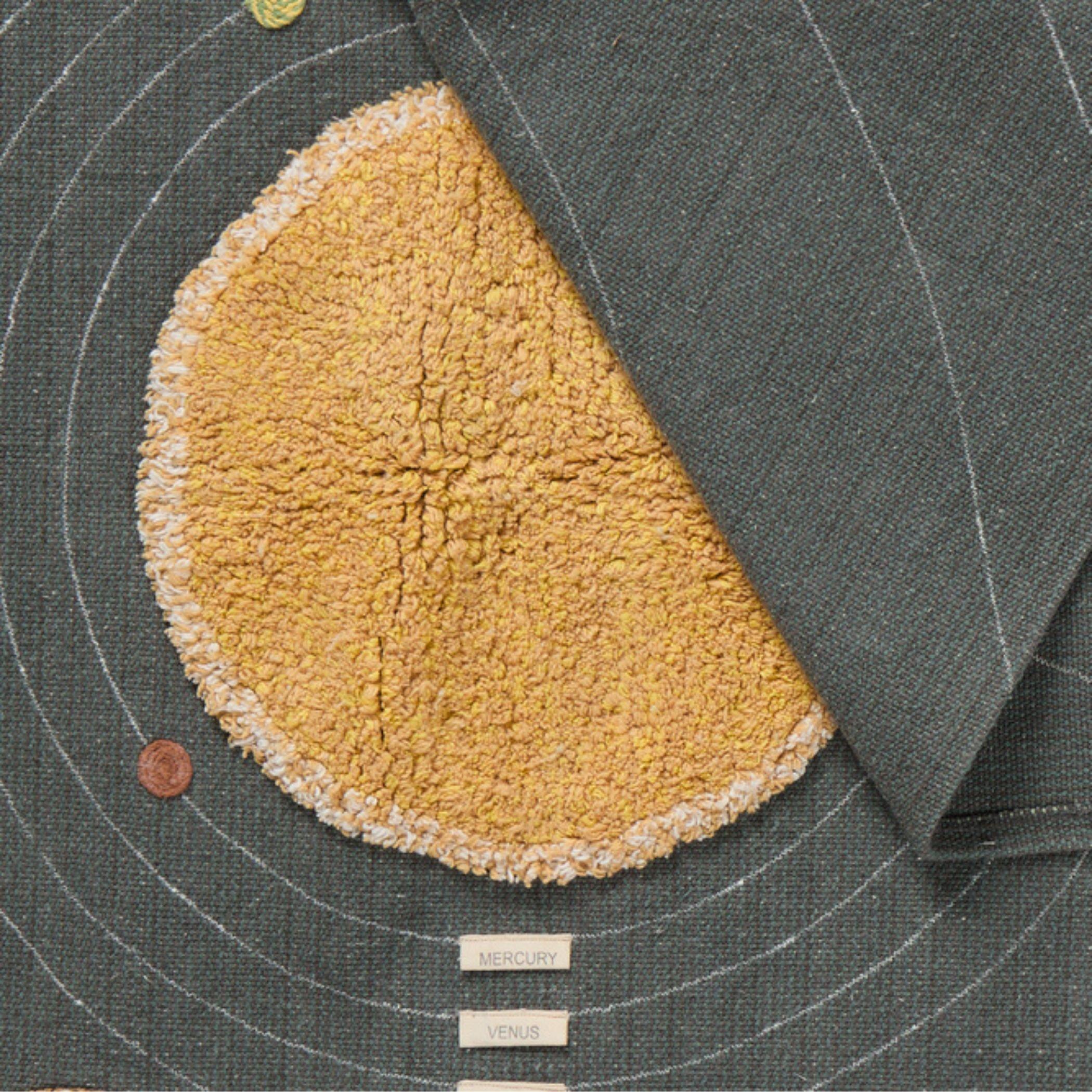 At its center lies a tufted yellow sun, surrounded by stitched orbits and planets in a spectrum of colors. Each planet is uniquely crafted using techniques such as yarn stitching, tufting, and careful handcrafting of larger planets using different canvas bases, cords, and yarn embroideries.