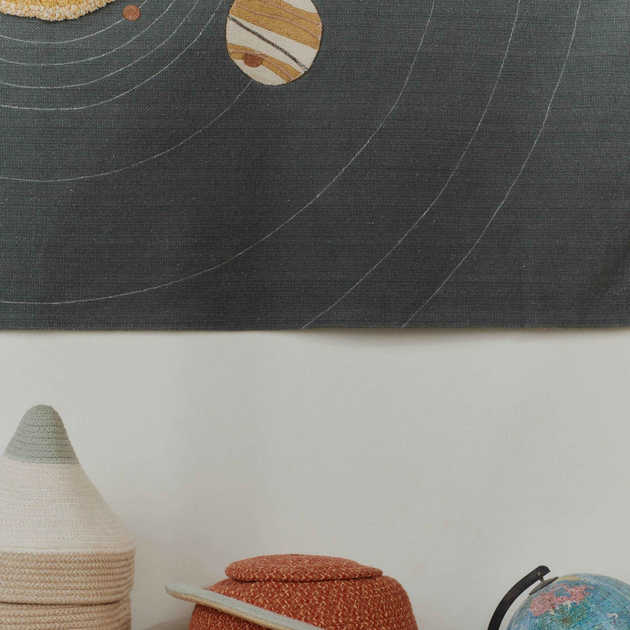 • Embark on a journey through space and explore the wonders of our Solar System with the Solar System Wall Hanger! This handcrafted wall decoration features a rectangular base made from a mix of dark grey and terrazzo green canvas.