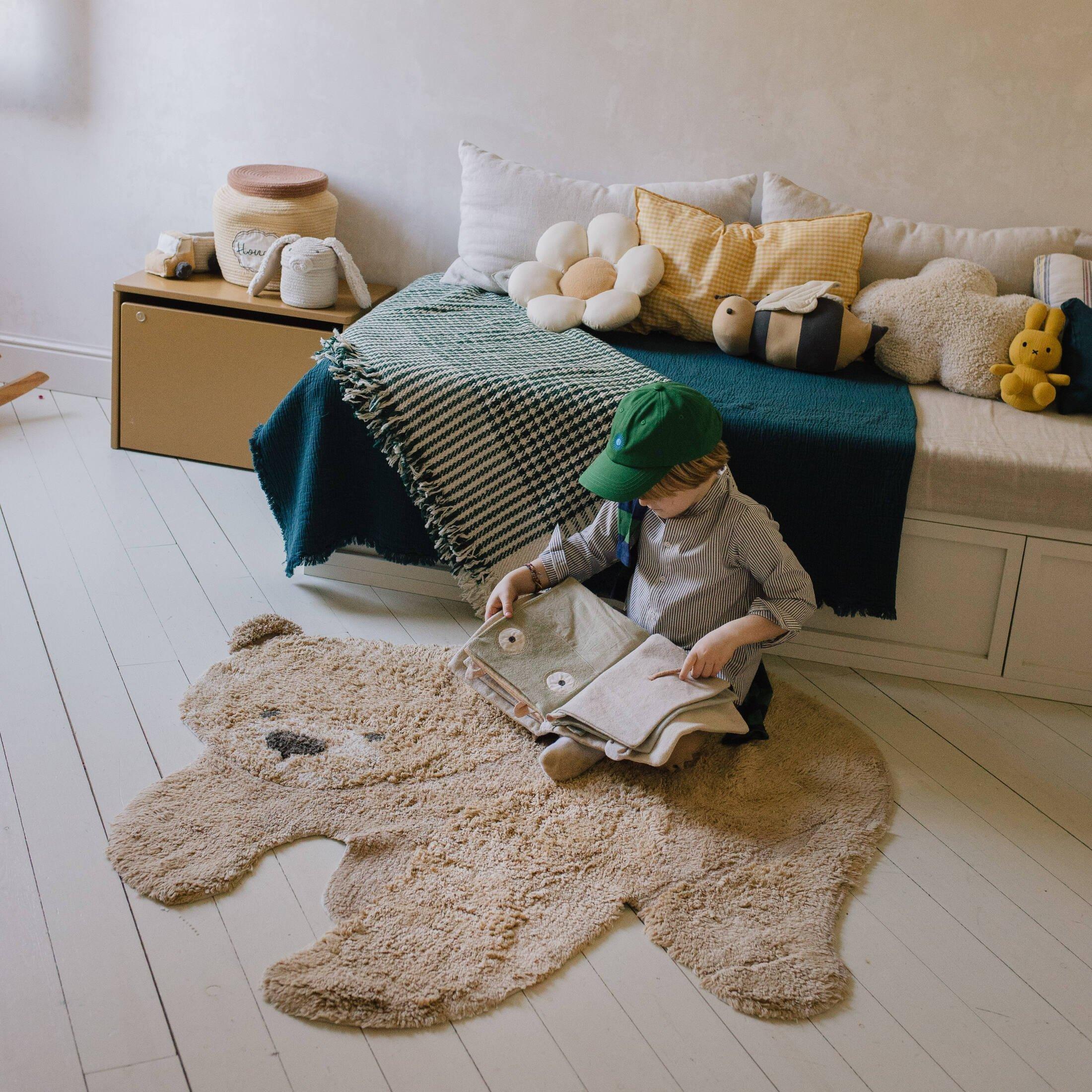 Inspired by the Sleepy Bear pouf, this shaped rug is sure to win the hearts of teddy bear lovers. Carefully handcrafted in soft shades of beige and honey, the Bear animal rug boasts a voluminous mouth, brown eyes, and three-dimensional furry ears.