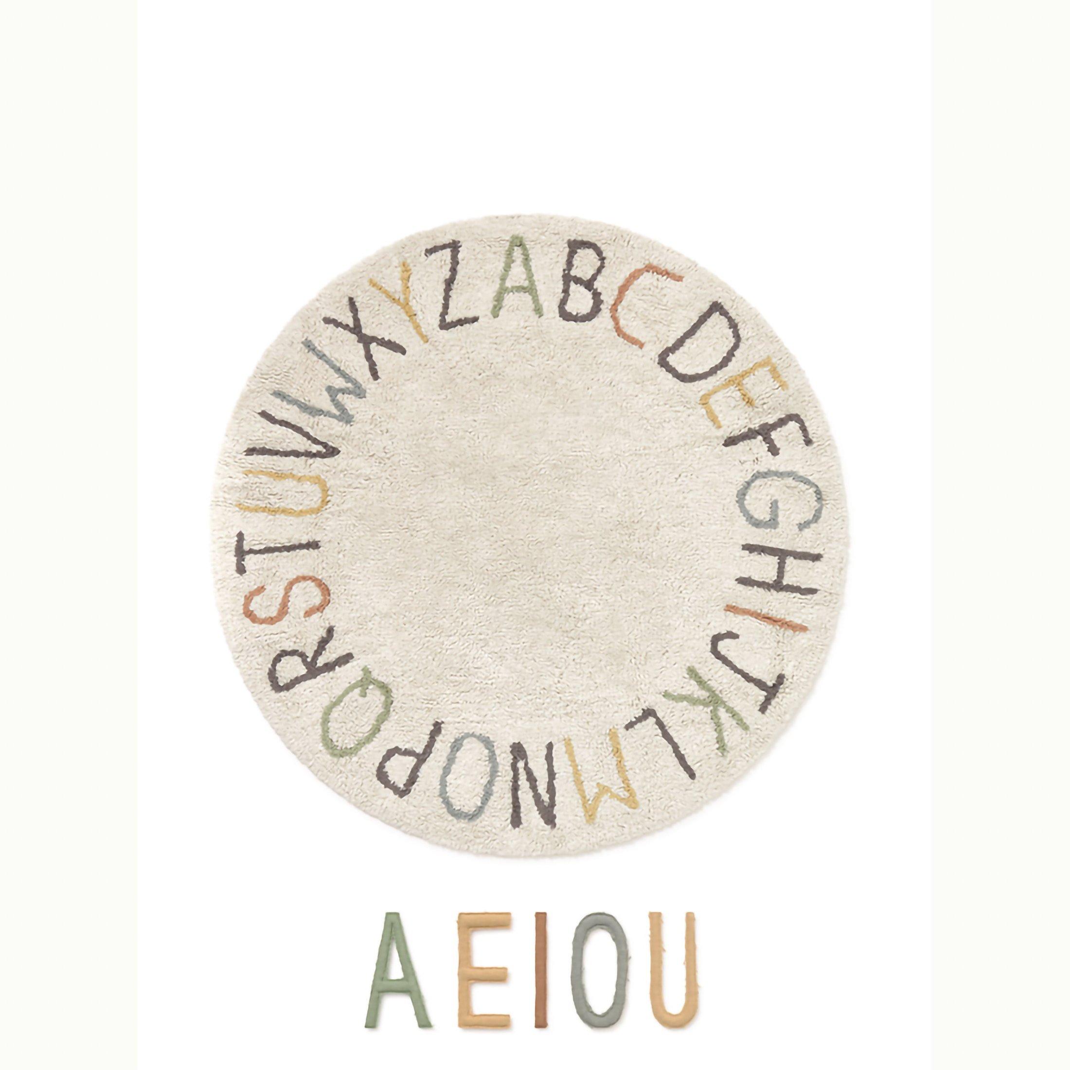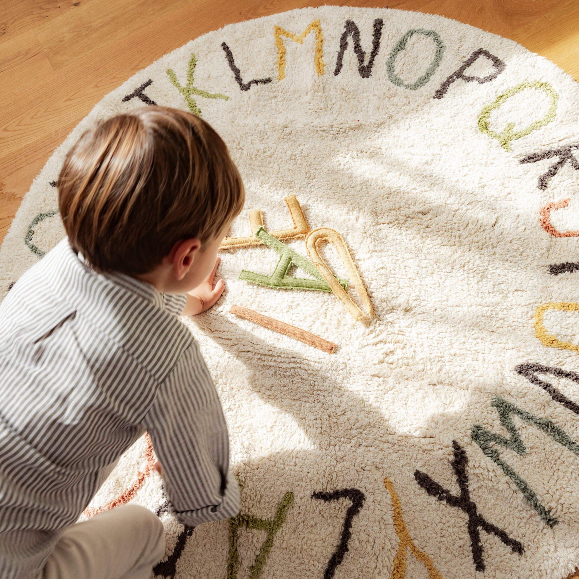 • A playful rug for kids to learn their ABCs! Inspired by our best-selling ABC design, this 120cm rug features tufted letters in fun colors and a lighter base in natural and ivory tones. The set includes mini canvas cushions for the vowels, making learning interactive. Perfect for educational play in any space!