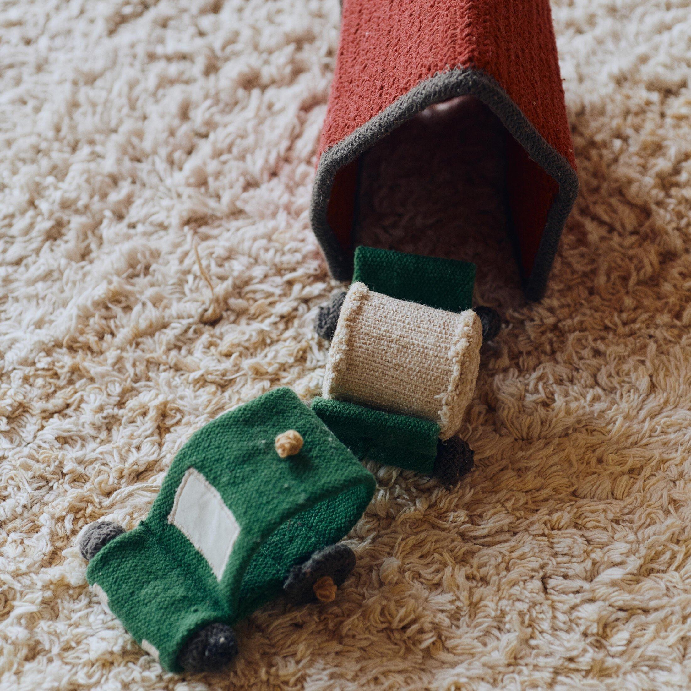 a mini truck, a mini chicken, and a mini haystack—this rug creates