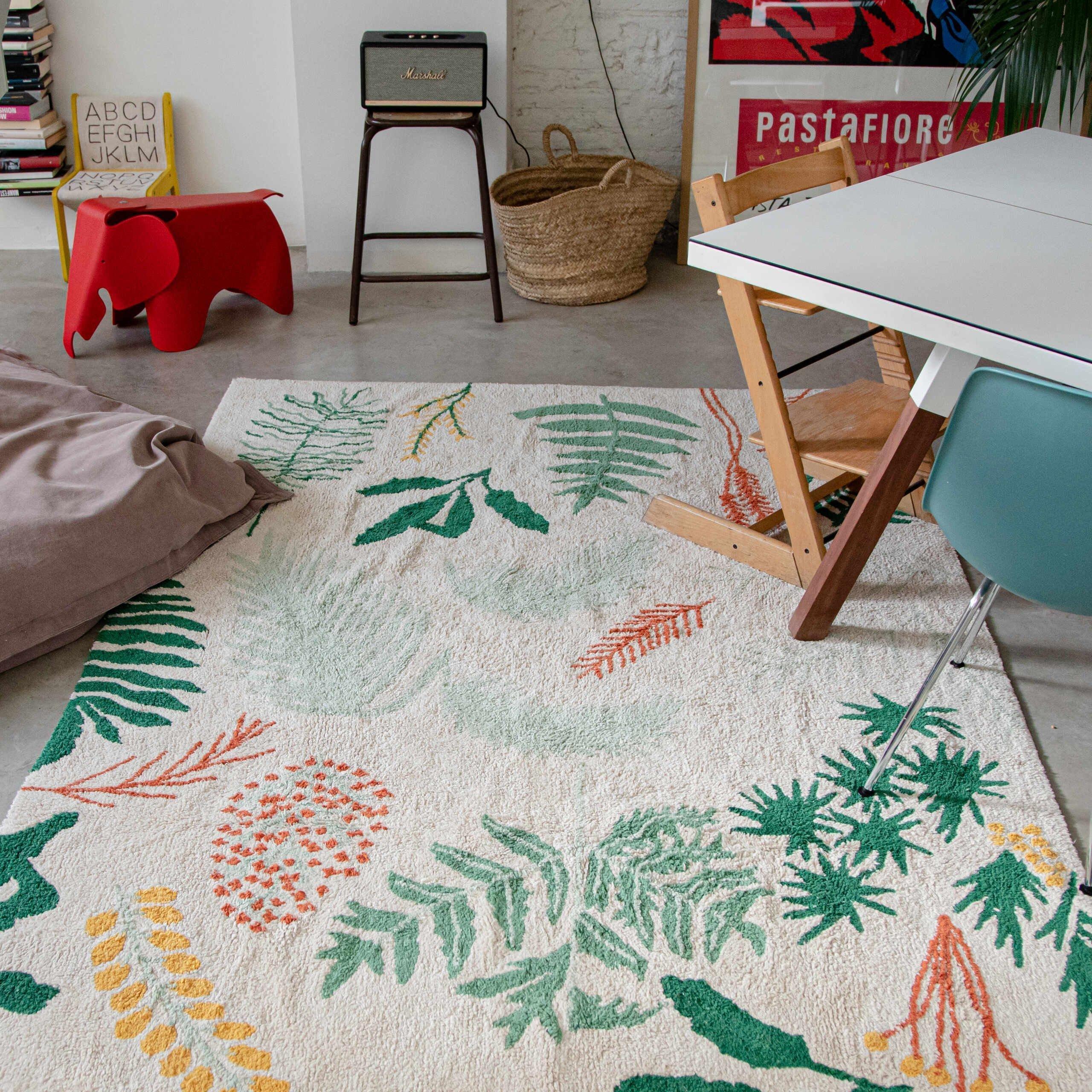 Just like plants, this rug can be placed anywhere, whether in the nursery or the living room. A botanical-inspired design, as a cut-out of nature. Its vibrant color palette is evocative of many seasons: aqua blue for winter, golden yellow for summer, terracotta for autumn and bright green for spring.