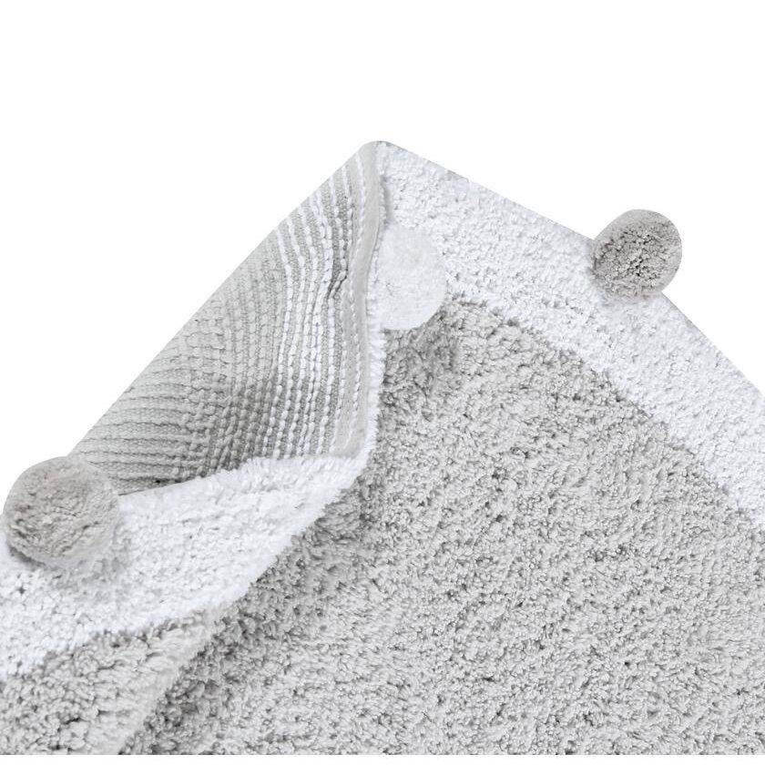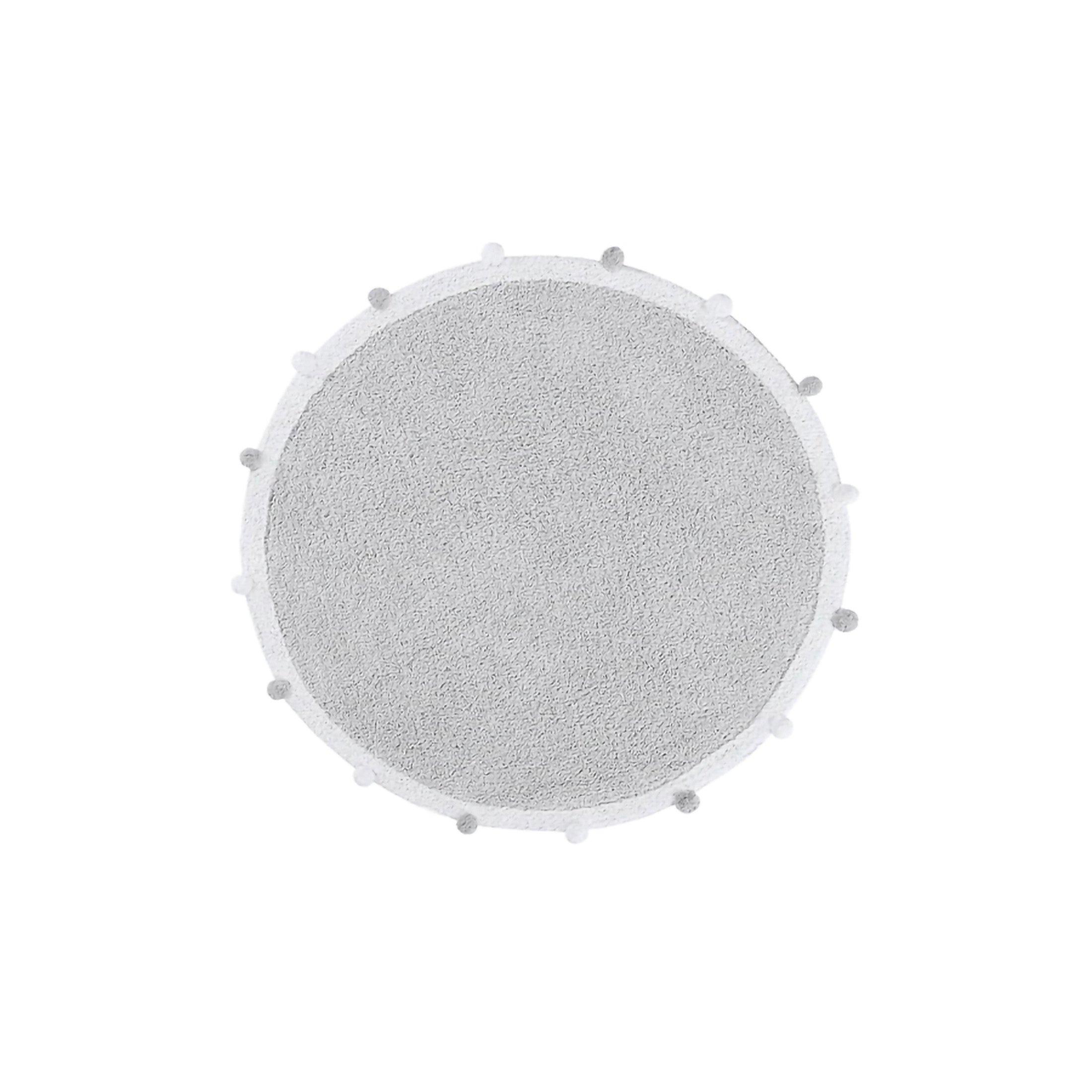 Round rug, Light grey base with white border and cotton balls in white and grey color around the rug.