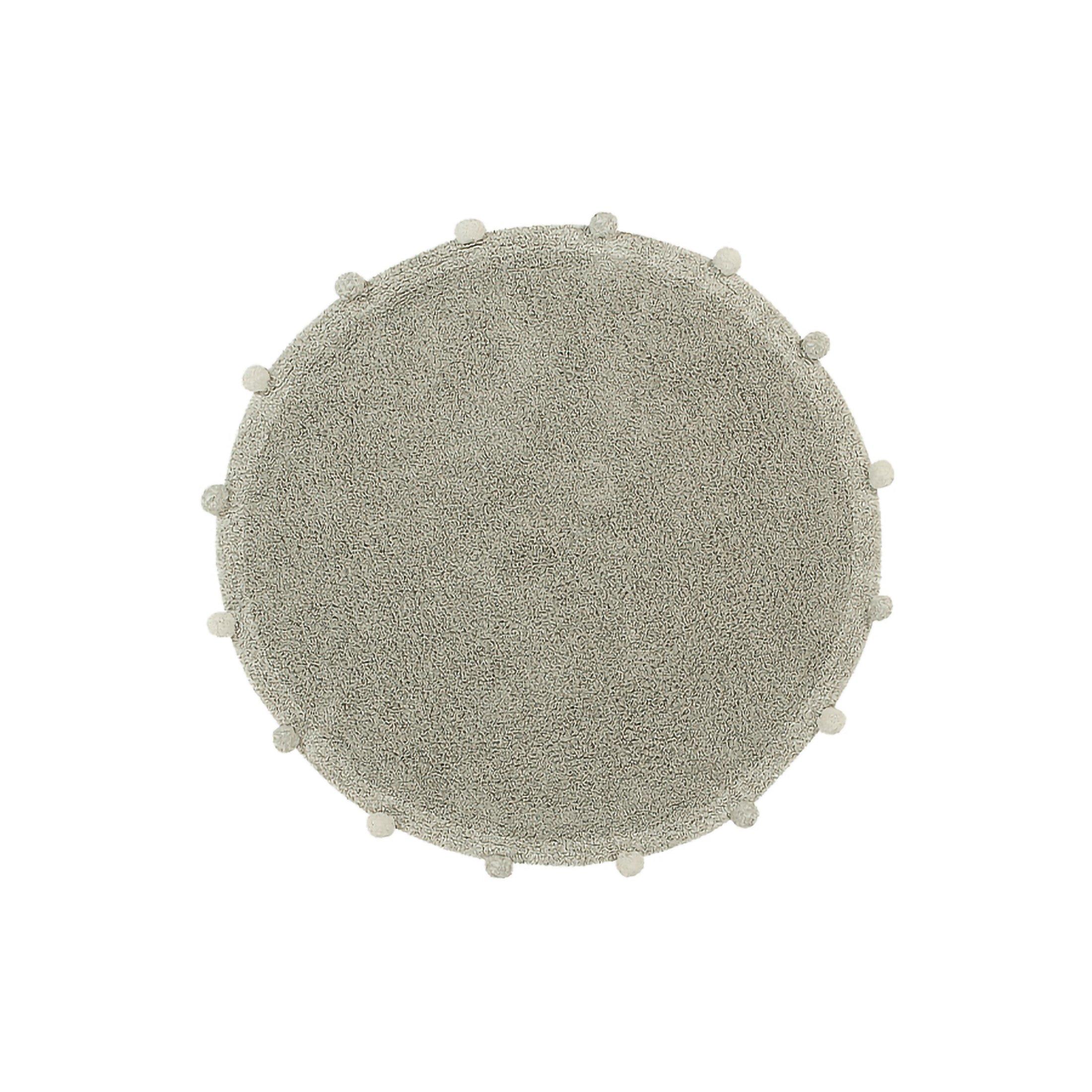 • Round shaped soft cotton rug in soft Olive color with border in Natural and Olive colors, and finished with matching cotton pompons all around