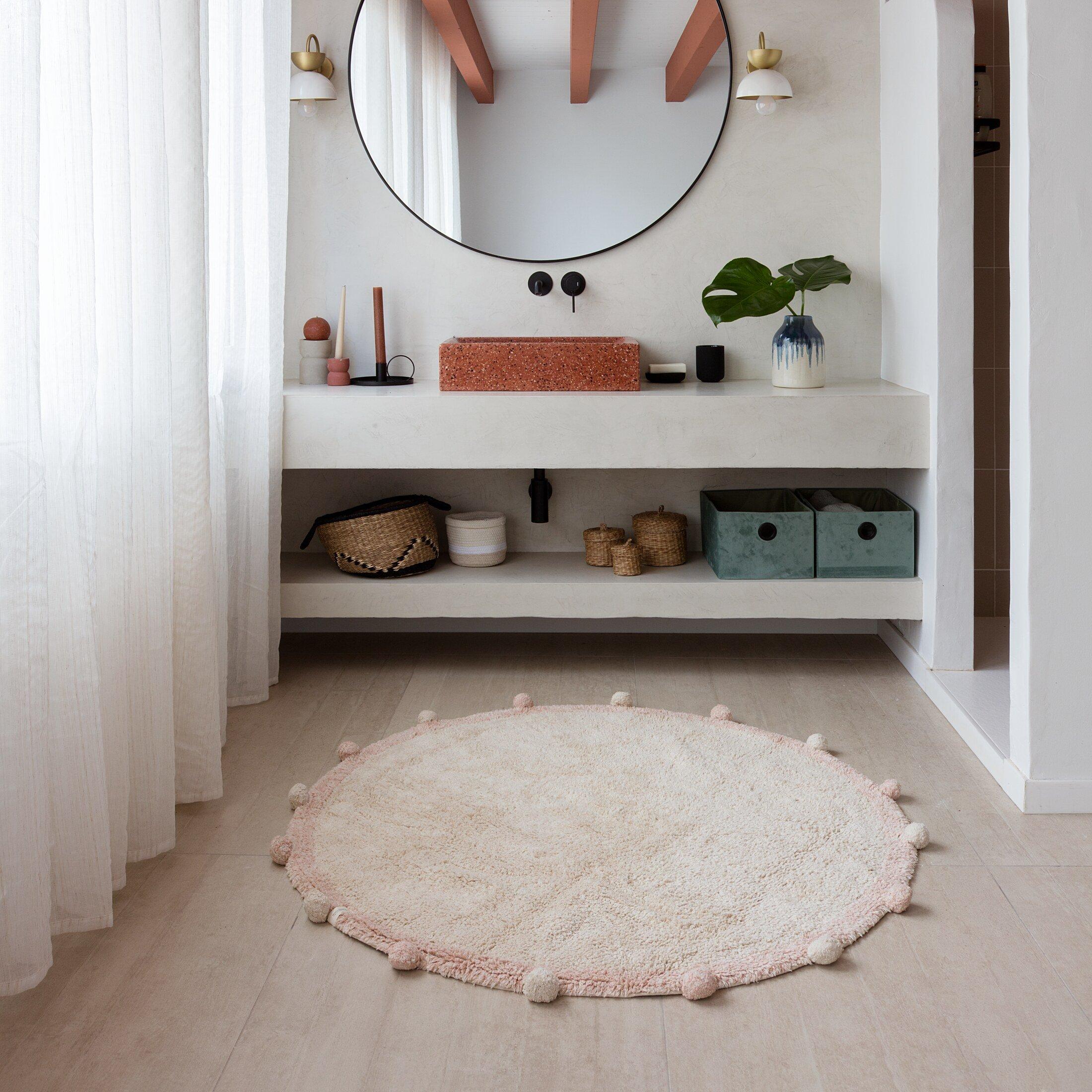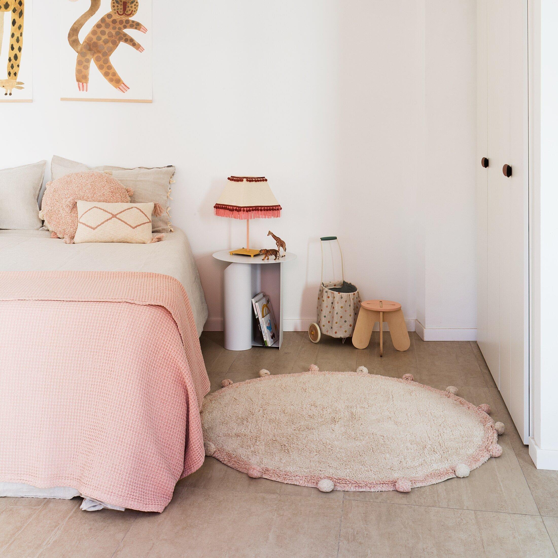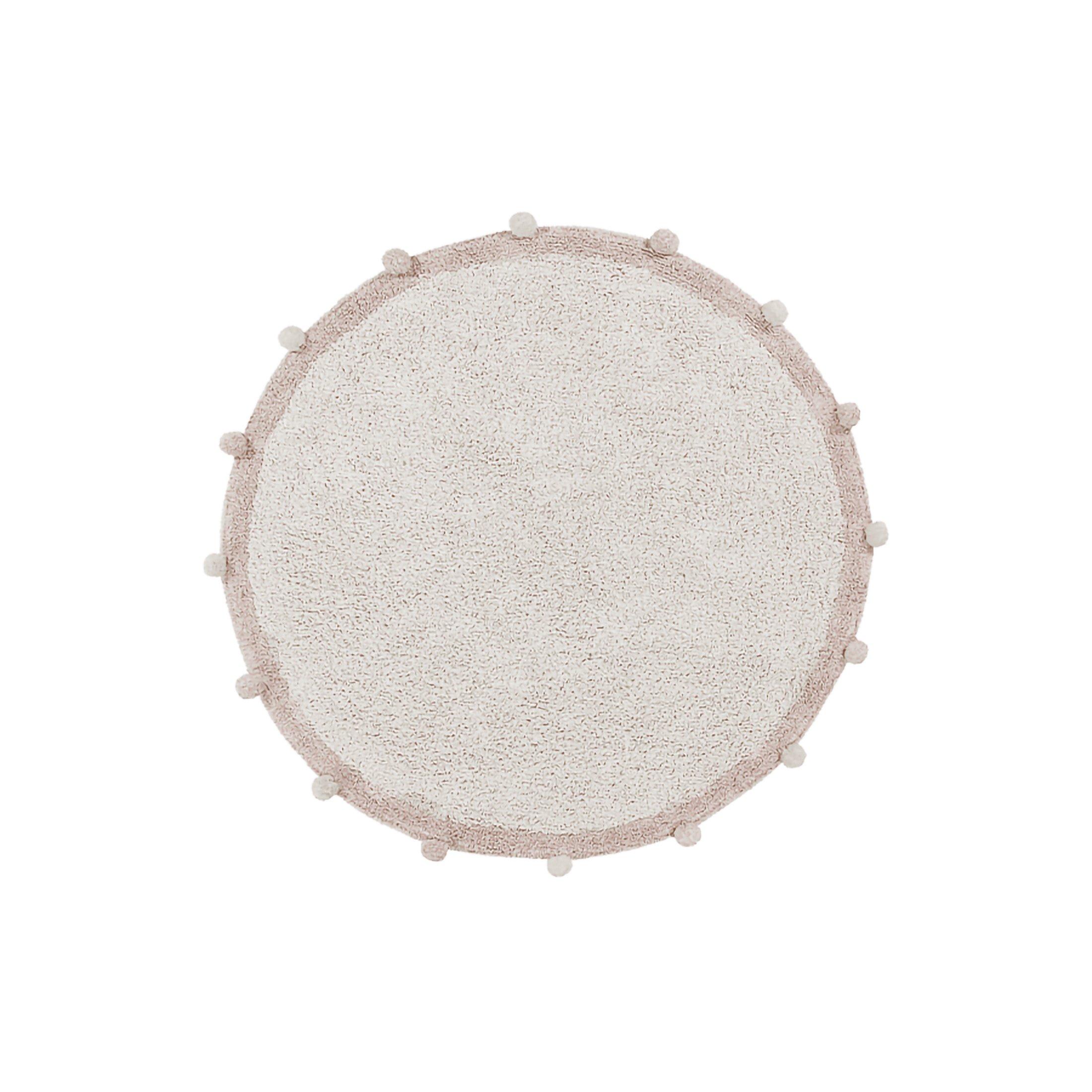 • Round shaped soft cotton rug in Natural color with border in Natural and Vintage Nude colors, and finished with matching cotton pompons all around