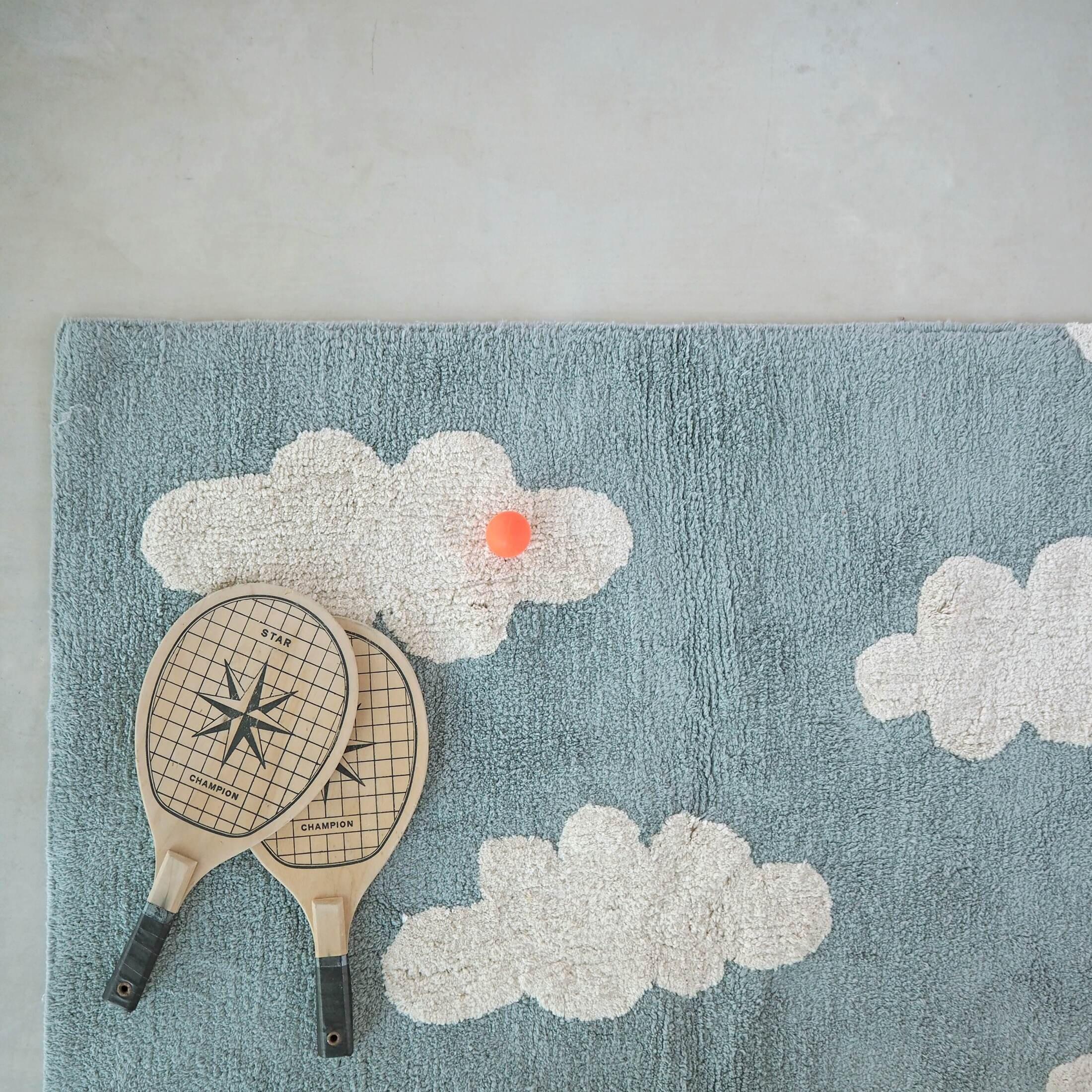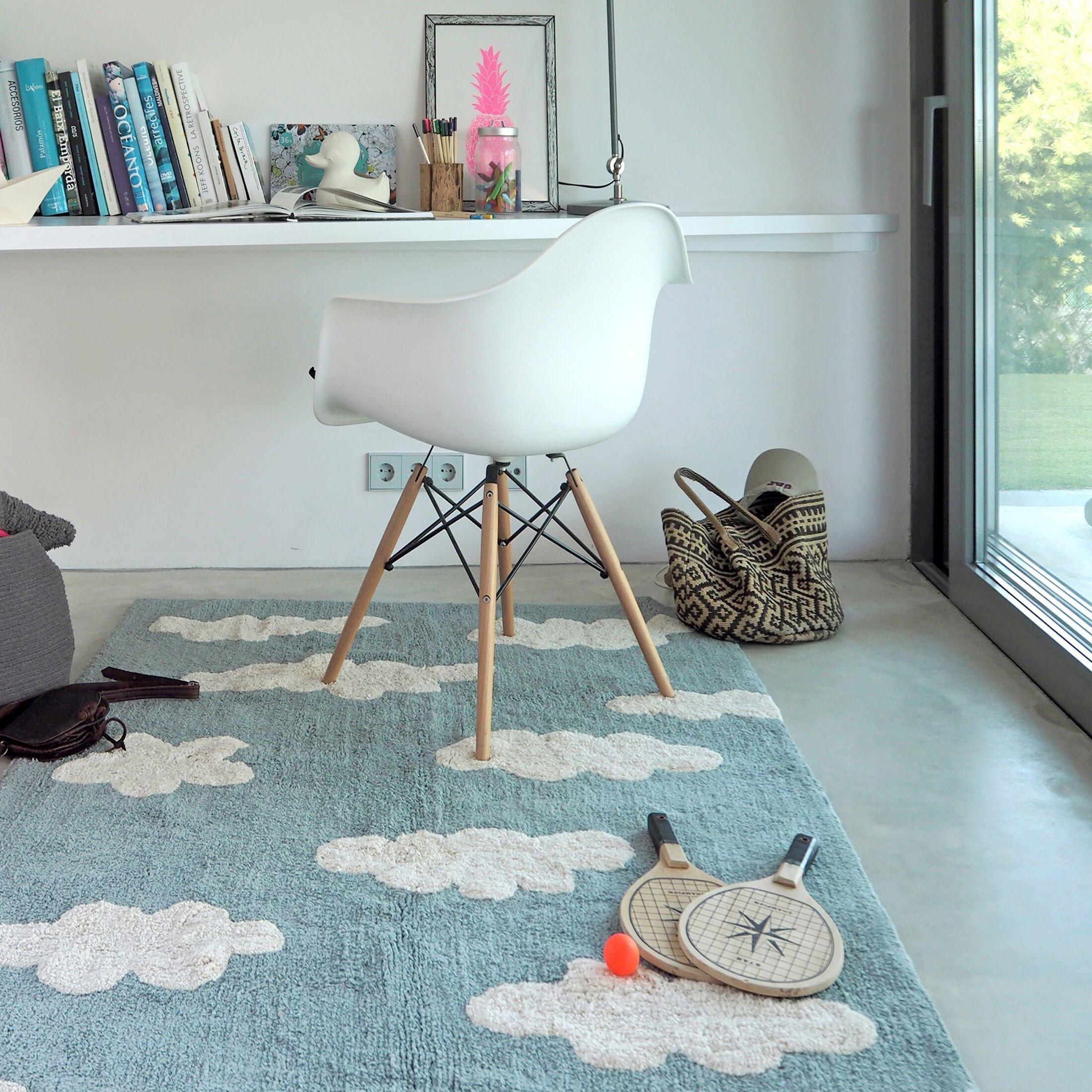 This washable kids’ rug is like a piece of heaven. The perfect finishing touch for any bedroom or playroom, in a soft shade of vintage blue base with natural colour clouds.. Time to hop onto fluffy clouds and surf the sky for some daydreaming fun!