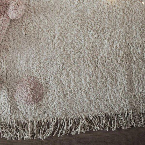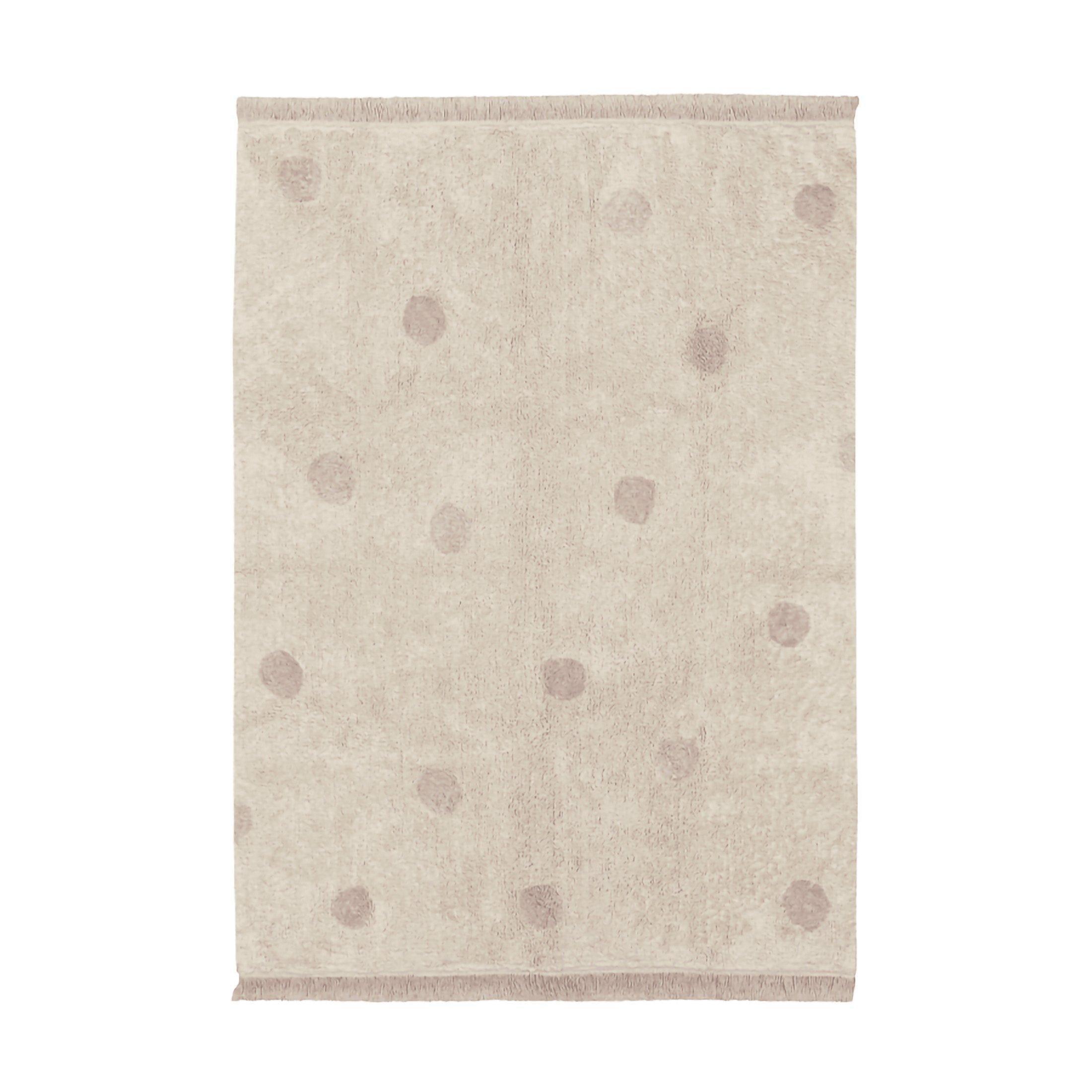 Rectangular soft cotton rug with base in Natural color and polka dots design in mixed Vintage Nude and Natural yarn, achieving a soft shaded effect. Finished with natural fringes at edges