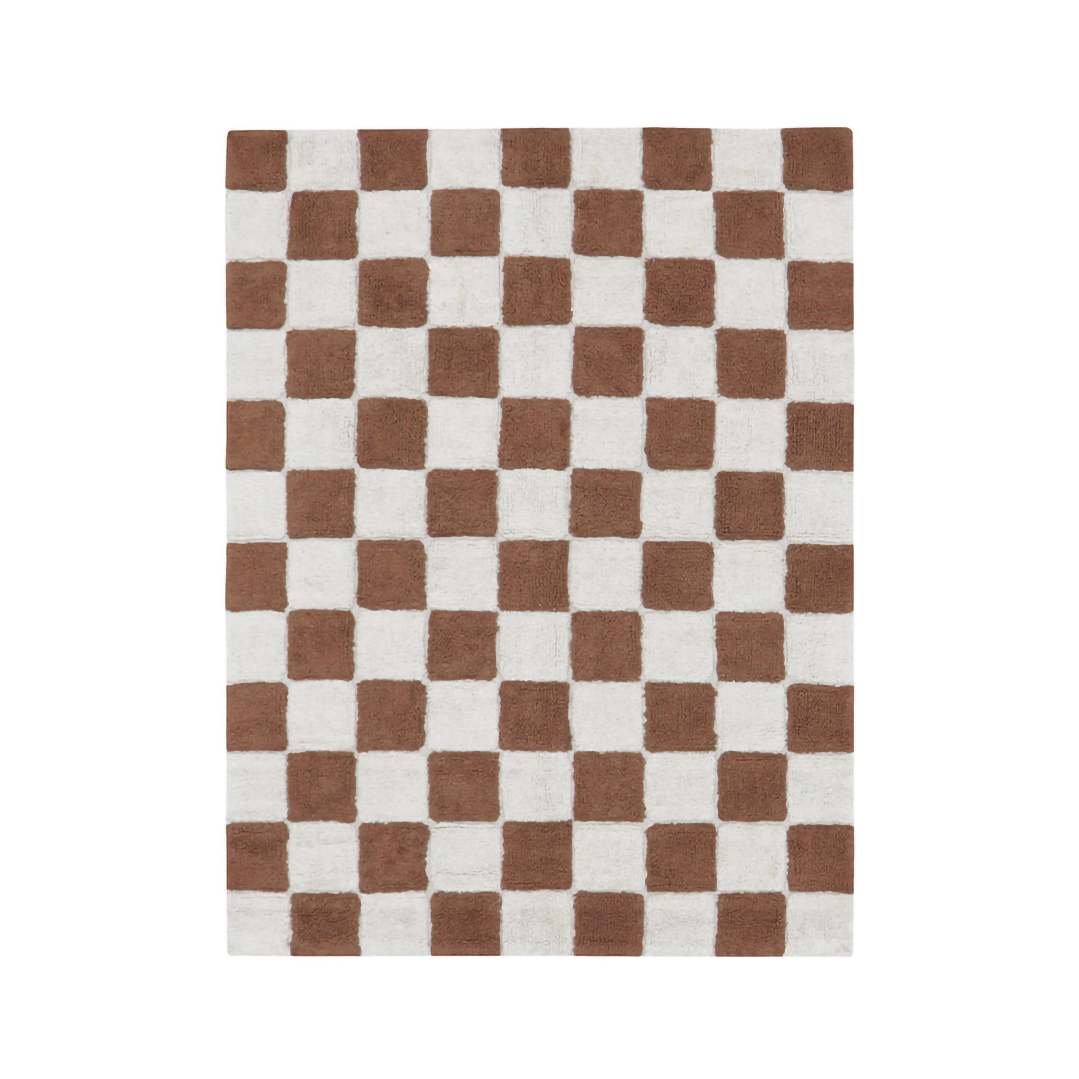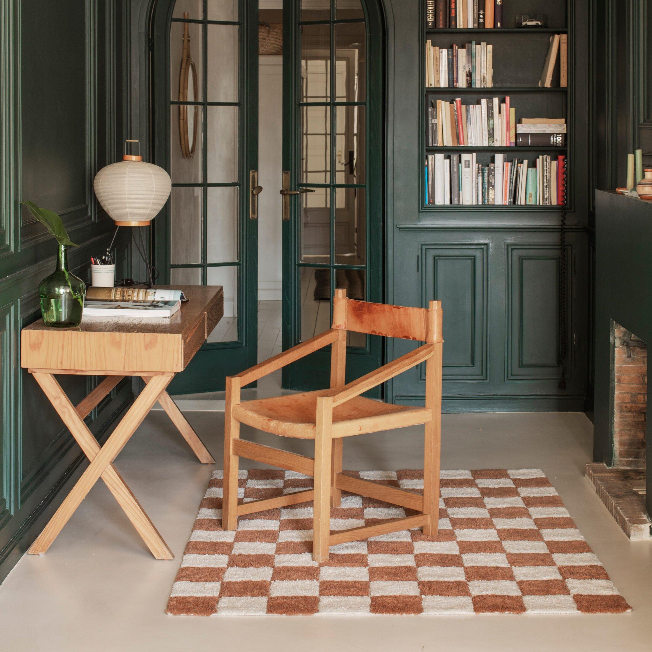 Inspired by vintage ceramic floors, the Kitchen Tiles rug features a checkered pattern playing with contrasting natural and toffee colors. The rug used our RugCycled mix / Natural canvas base, leaving the base slightly visible in between the colored squares simulating the kitchen tiles.