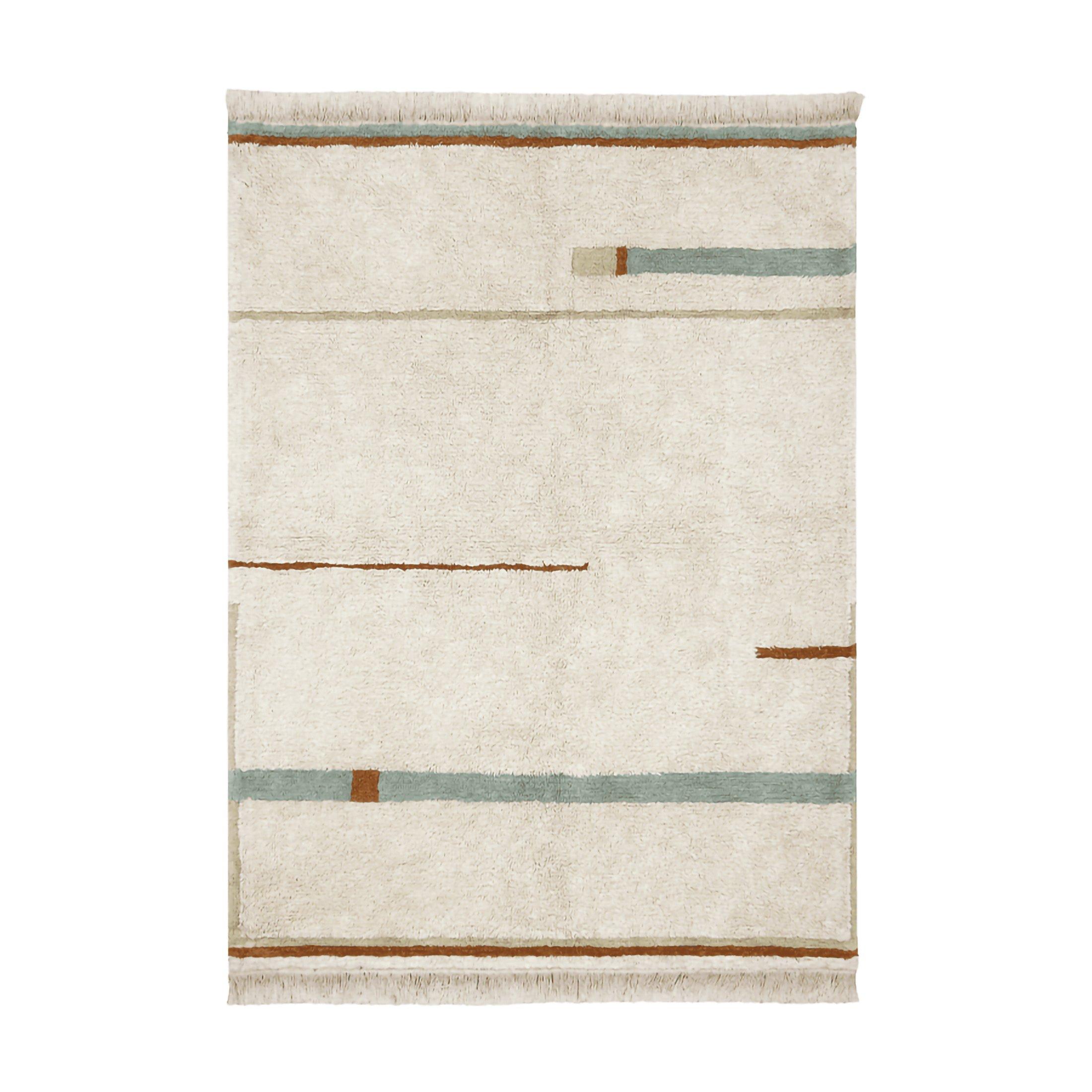Washable rug inspired by a pattern of wide and narrow lanes. The rug plays with different pile heights, where the longer soft plush in natural color combines with contrasted colored lines of Vintage Blue, Toffee and Light Olive in extra short piles. Finished with natural color fringes at the borders