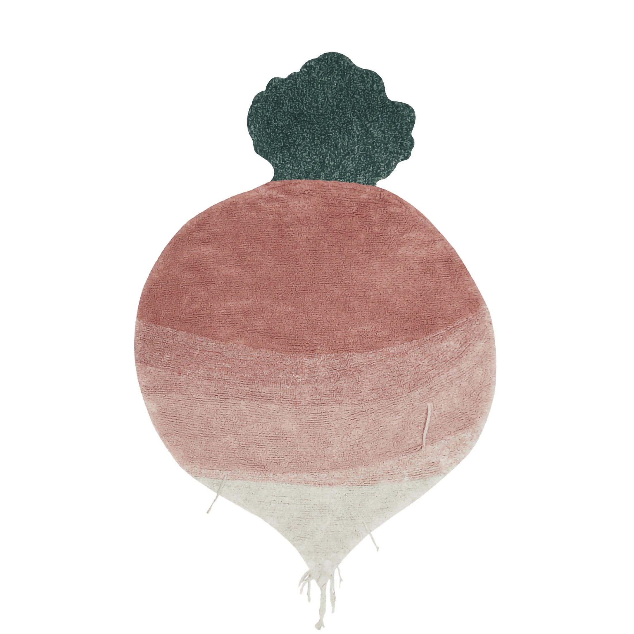 Washable cotton rug shaped as a big radish, in pink shades combined with ivory, and green leaves on top. The rug is finished with irregular braids attached on top and at the bottom part of the radish.