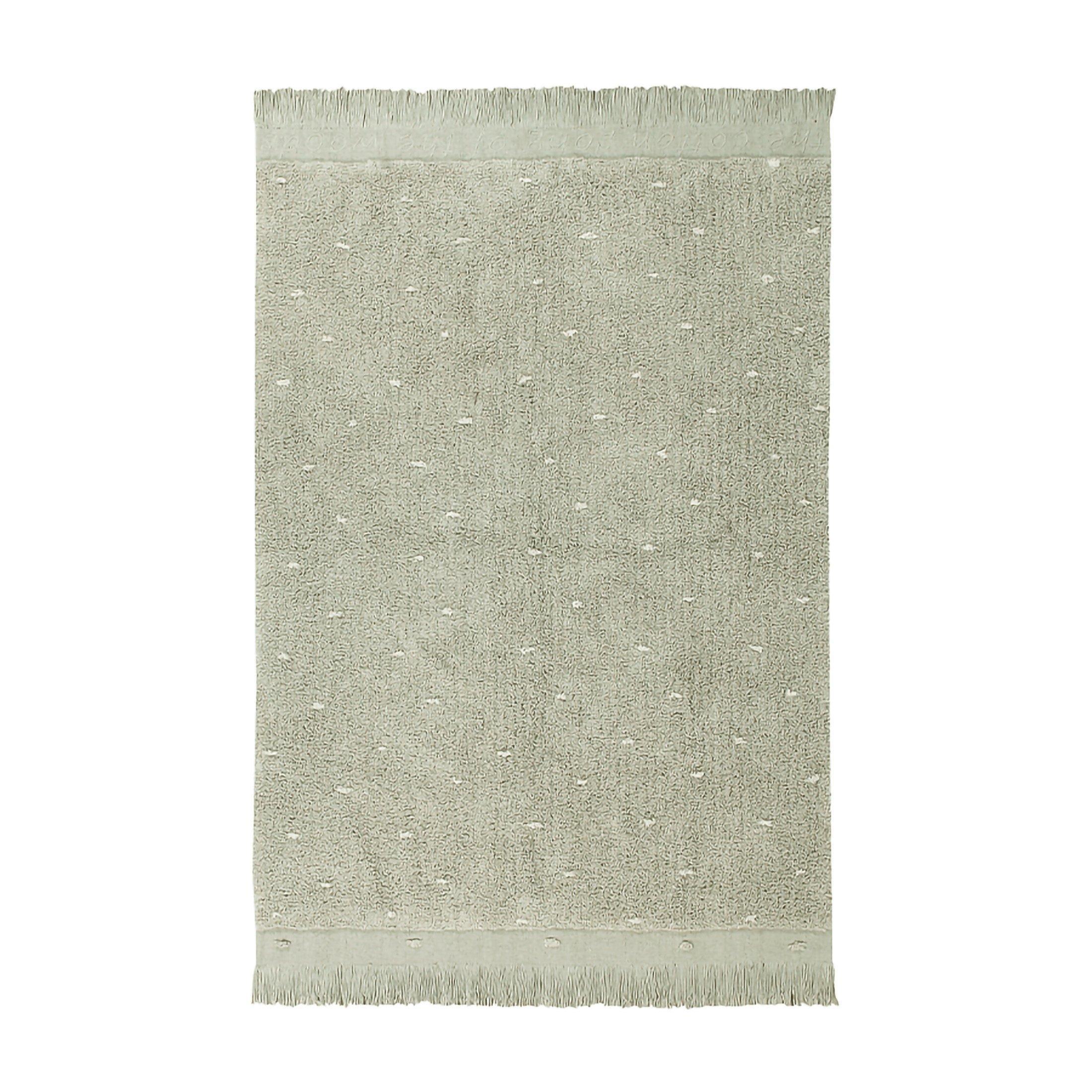 Rectangular cotton rug with tiny dots in Natural color simulating grass, on Olive cotton base. Canvas base in mixed Olive and Coffee, visible at the edges and followed by fringes in the same color. Dots on one of the edges and on the other a phrase in embroidery: The cotton song of the woods.
