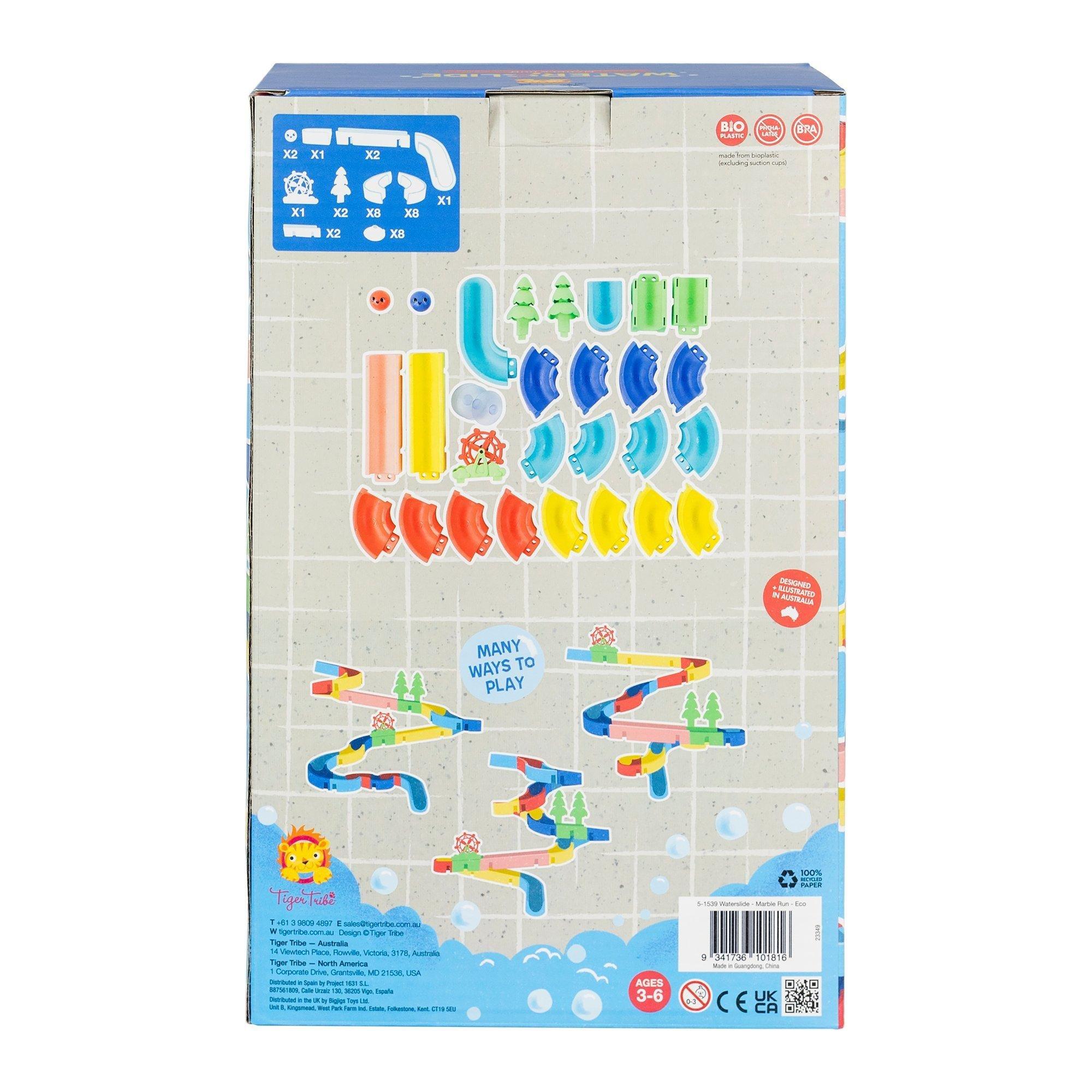 • Little ones will love designing and constructing their own miniature waterslide marble run with this interactive bath toy. With 25 configurable pieces, kids will love customizing their waterslide’s wet and wild path for the funny-faced ‘marbles’ to journey down!