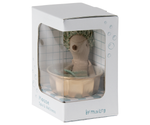 • Rub a Dub Dub there is a mouse in the tub. Ms. Mouse gets squeaky clean in the tub, but her ears stay dry with her shower cap. She uses a cute gold metal cup for her tub. Every mouse needs a spa day!