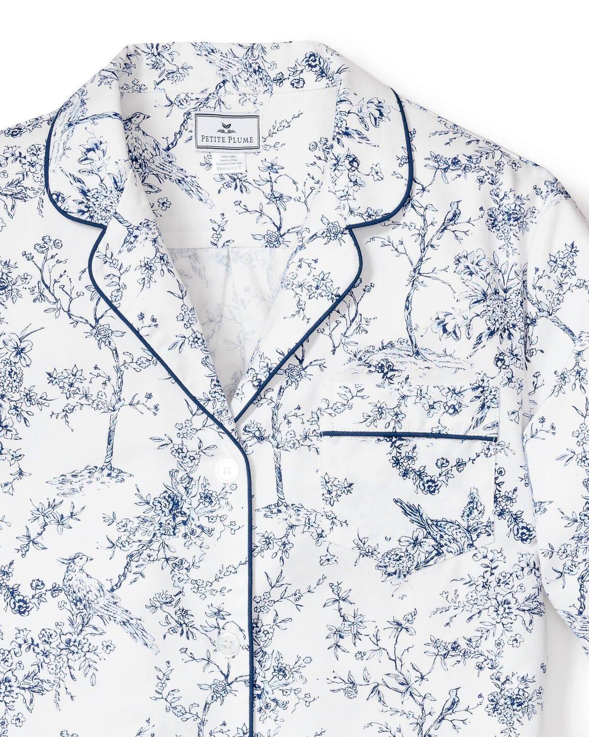 Timeless beauty meets botanical elegance. Featuring hand-drawn illustrations of delicate botanical flowers in a striking shades of blue and white, this classic print is where refined luxury and botanical serenity collide. This classic pajama set is accented with contrast navy piping and finished with logo buttons.