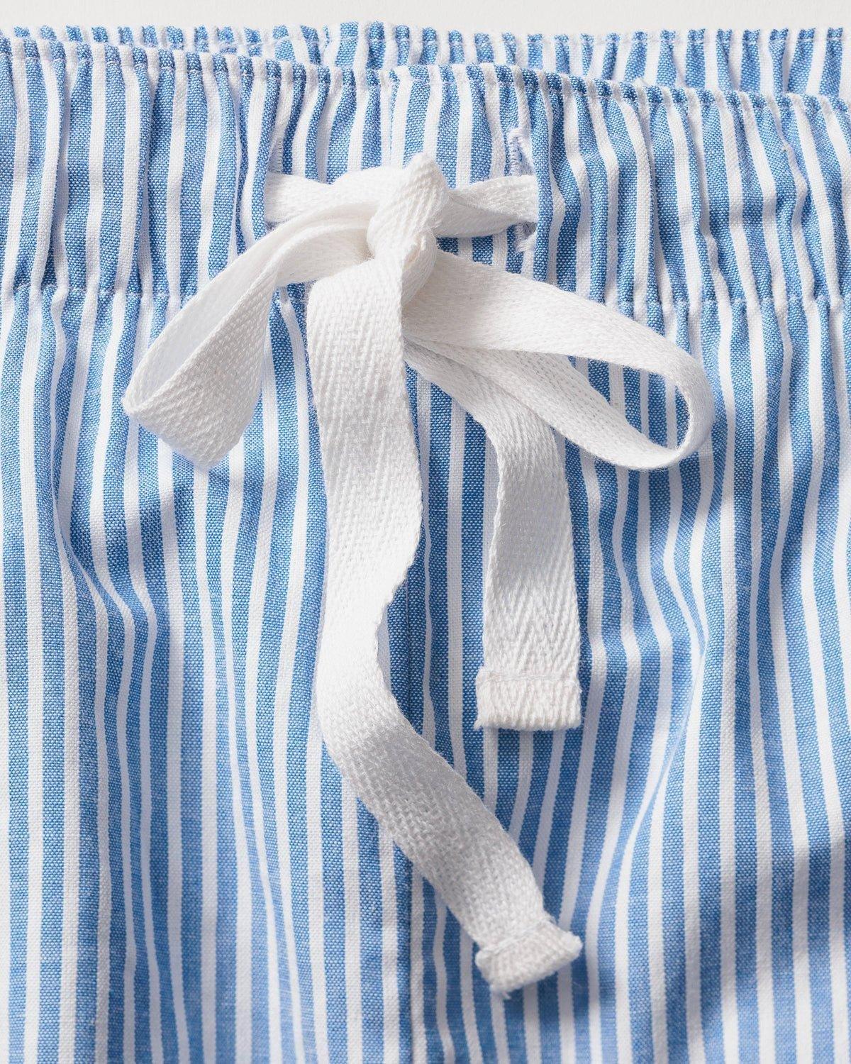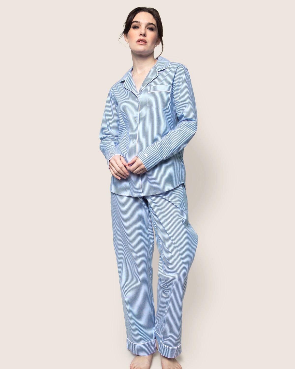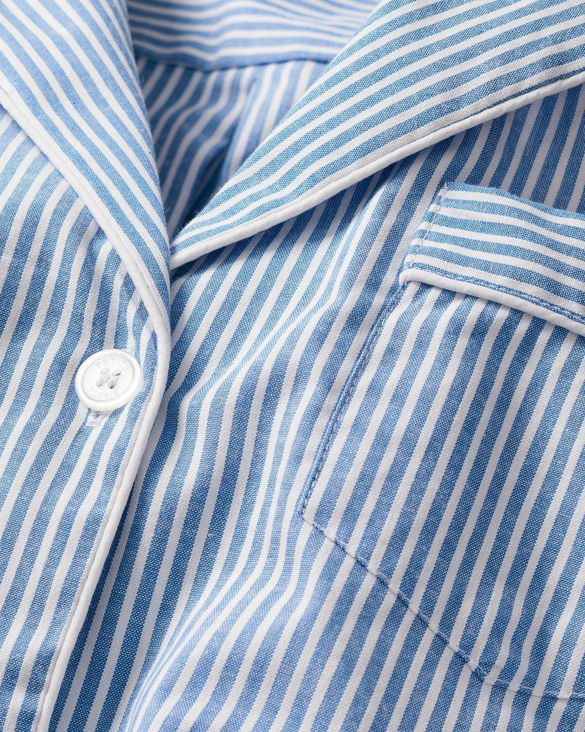• Seersucker or railroad stripe as it is sometimes referred is the perfect lightweight fabric dating back to the British colonial period. This classic pajama set is accented with white piping and finished with pearl buttons.
