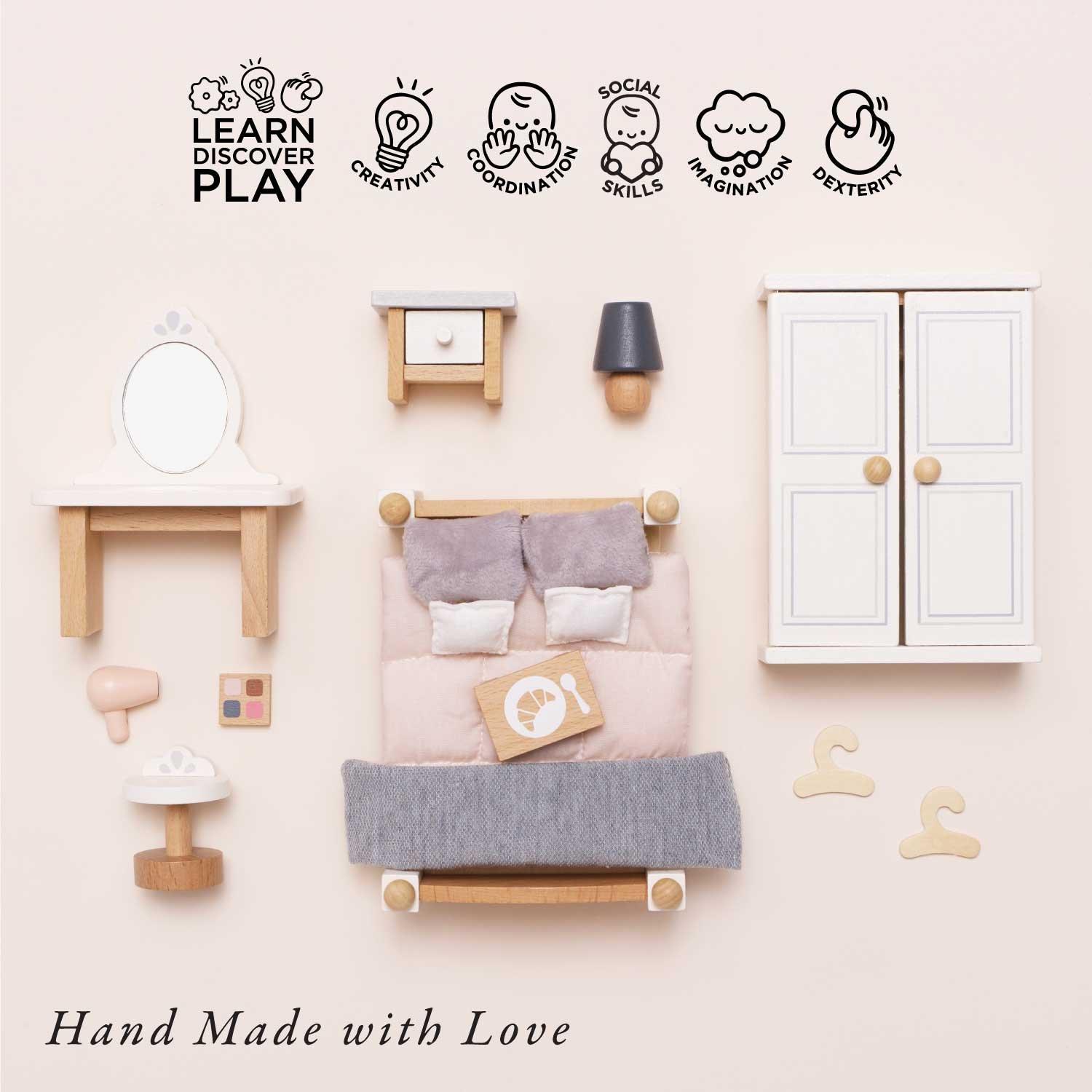 • This sweet miniature bedroom set is a real dream come true. With a classic design in lovely neutral tones, it is compatible with all of our beautiful wooden dolls houses and makes a stunning addition to any child’s small world play universe.