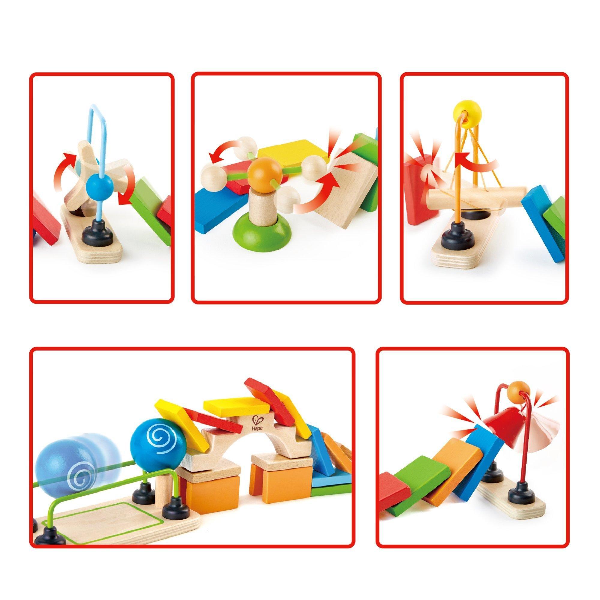 HAPE DYNAMO WOODEN DOMINOES SET – 107 PIECES – Build a colorful trail of 100 wooden dominoes. Add a bridge, bell, rails, and assorted tricks. Tap one rectangle and watch them all come tumbling down. STEAM value; Science, Technology, Engineering, Arts, & Math: Designed to engage kids in their early STEAM development, the Dynamo Dominoes encourages children’s spatial thinking abilities, 3 dimensional thinking, color recognition and will keep your little engineers coming back for more fun! The specially designed transmitters add more FUN! Special features include a bridge, a bell and assorted tricks that add more fun to the game. Durable Wood, Water Based Paints: The durable, child-safe paint finish and solid wood construction make this a toy that your child will love for years to come.