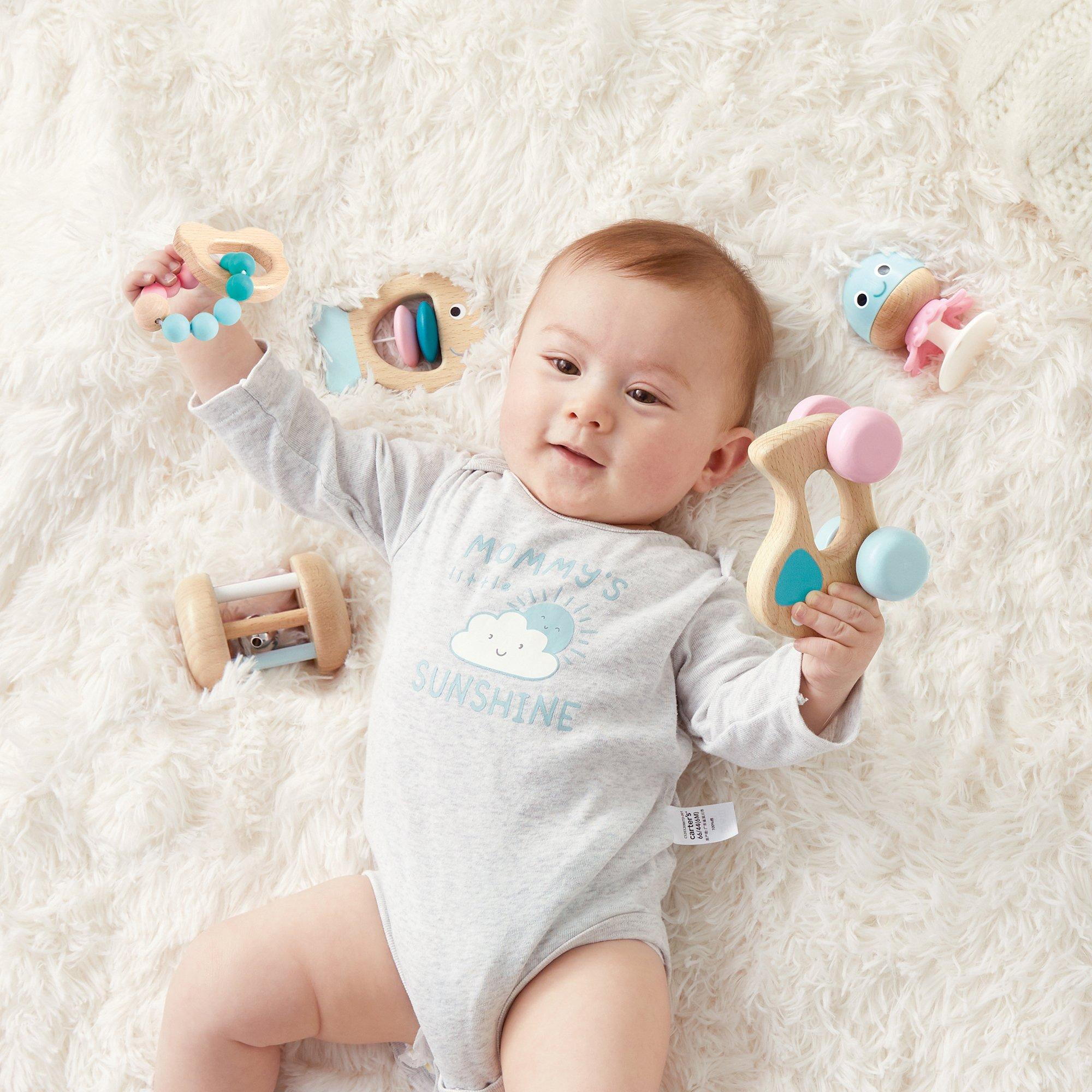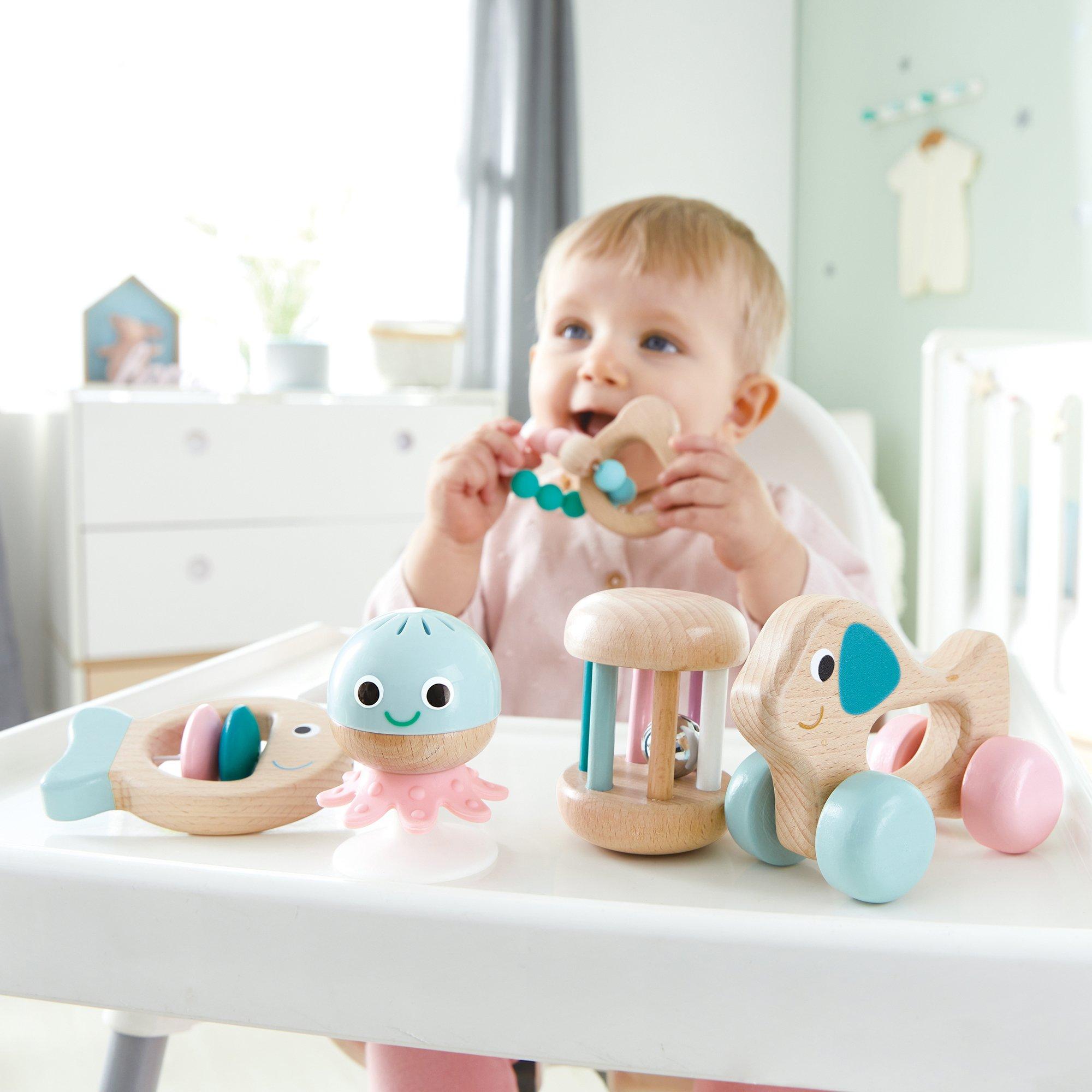 Includes one fish rattle, one beads teether, one stay put rattle, one rolling rattle and one dog on wheels.